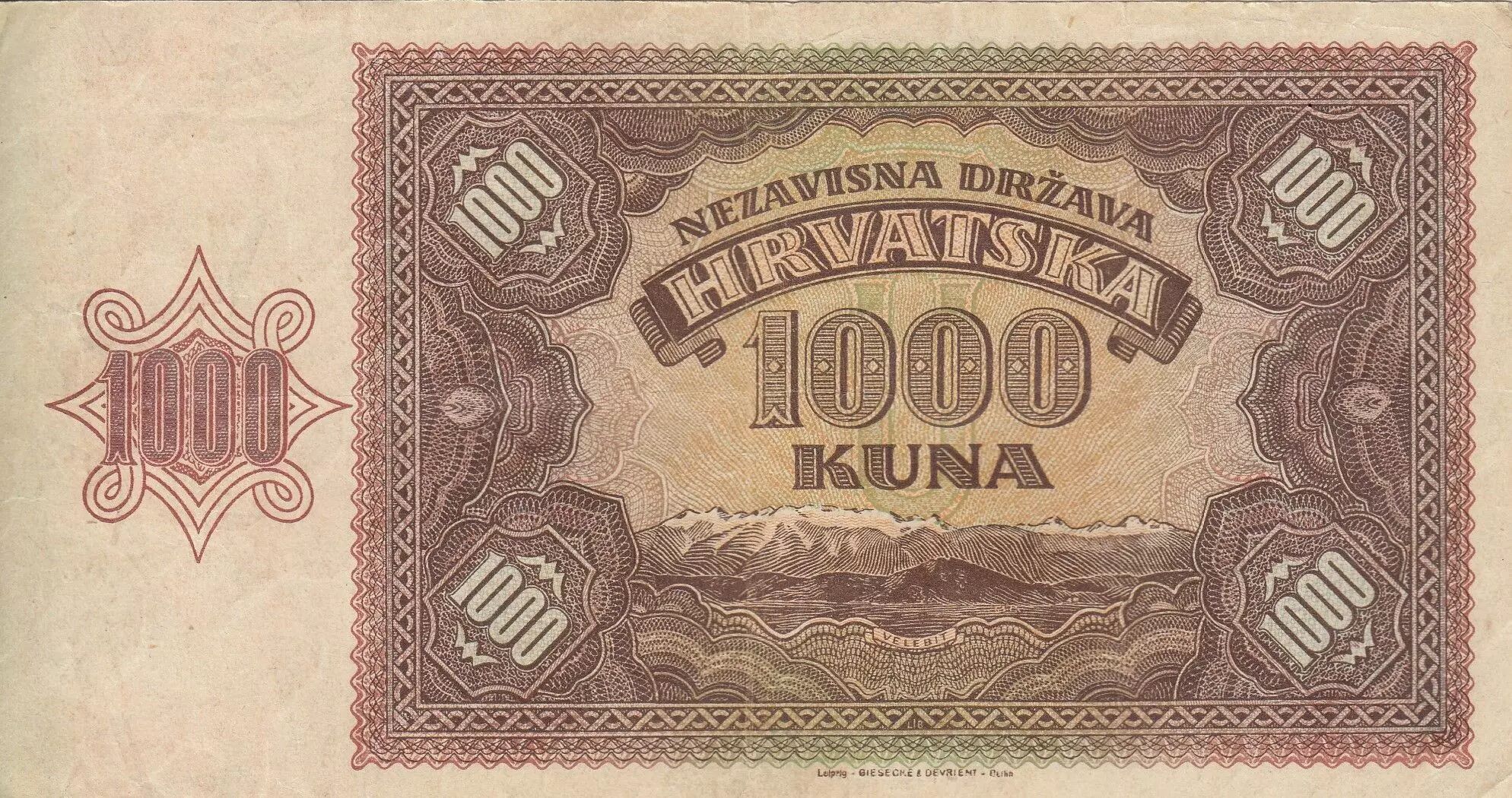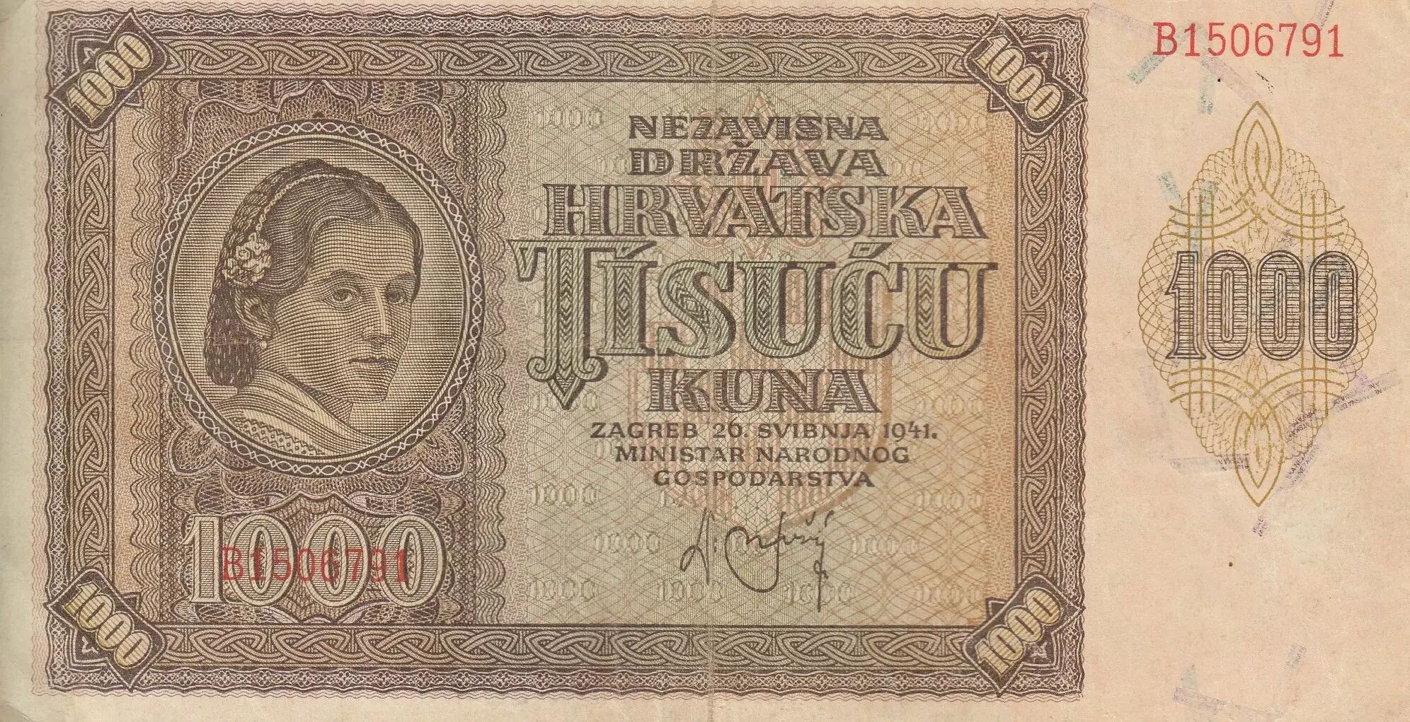 Home > World Banknotes > European Banknotes > Croatia > Croatia 1000 Kuna - Young girl - Mountains - 26-05-1941 - Serial B