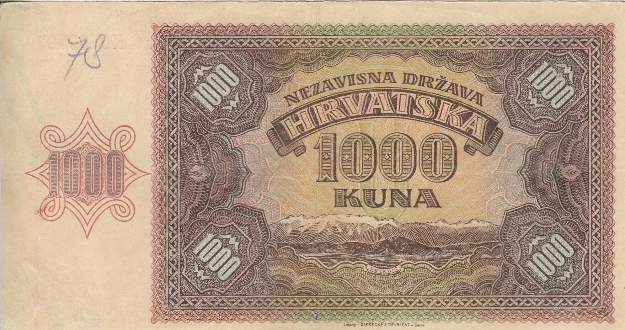 Banknote Croatia 1000 Kuna - Young girl - Mountains - 26-05-1941 - Serial K