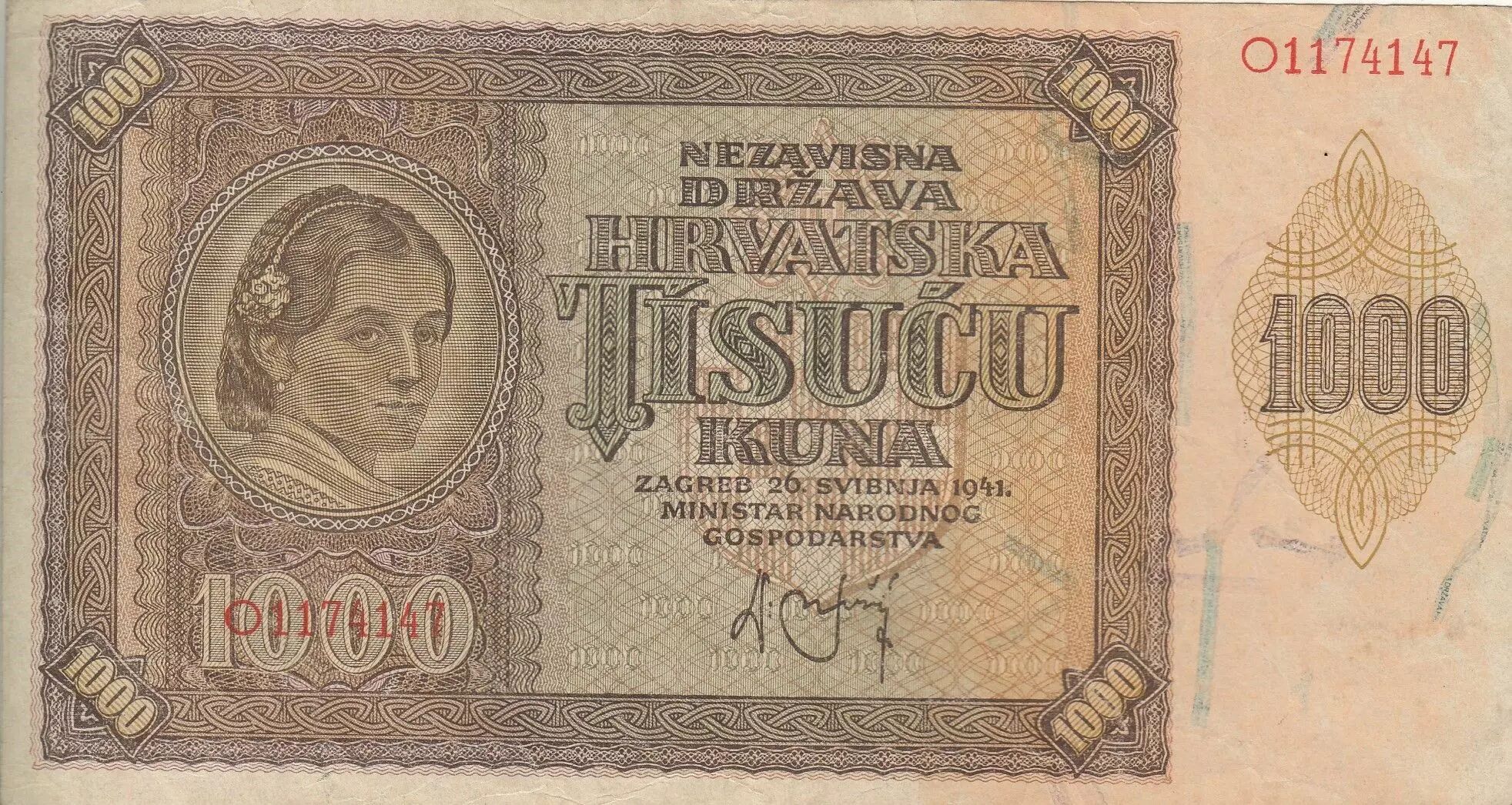 Home > World Banknotes > European Banknotes > Croatia > Croatia 1000 Kuna - Young girl - Mountains - 26-05-1941 - Serial O