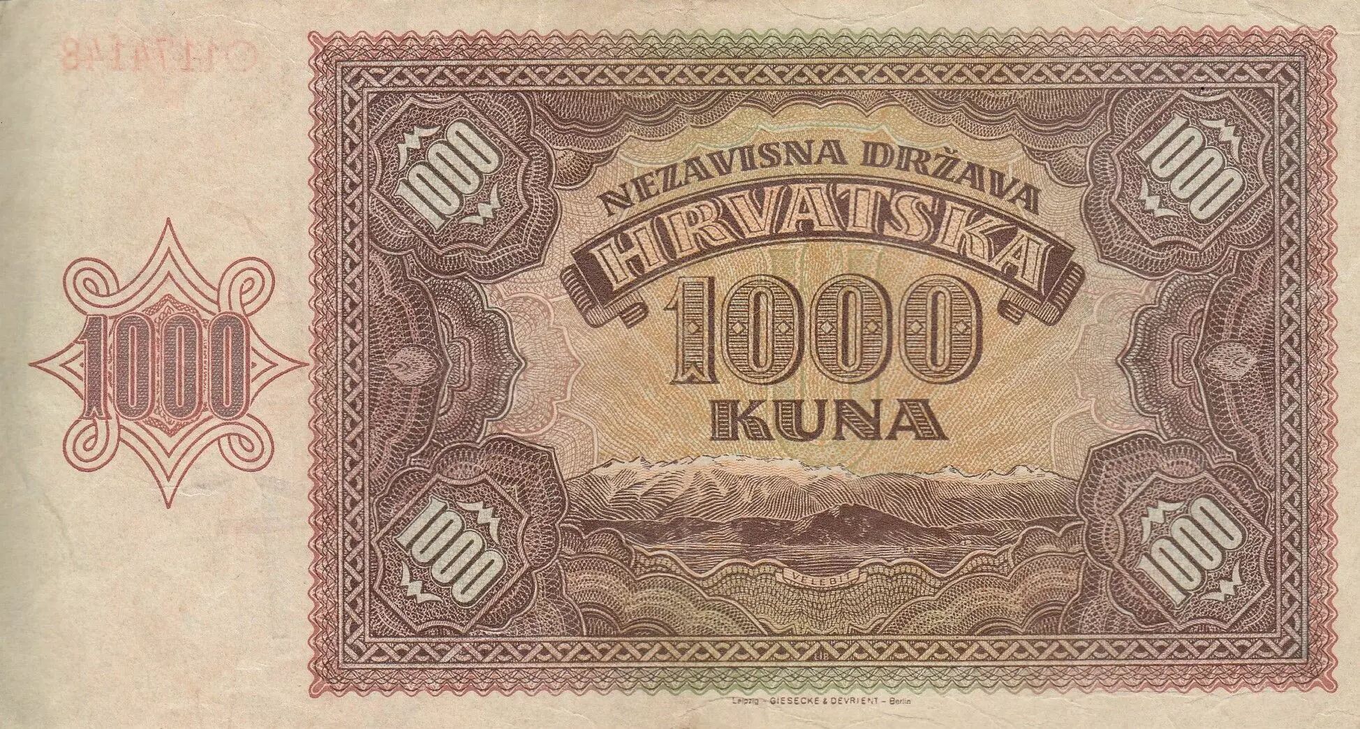 Banknote Croatia 1000 Kuna - Young girl - Mountains - 26-05-1941 - Serial O