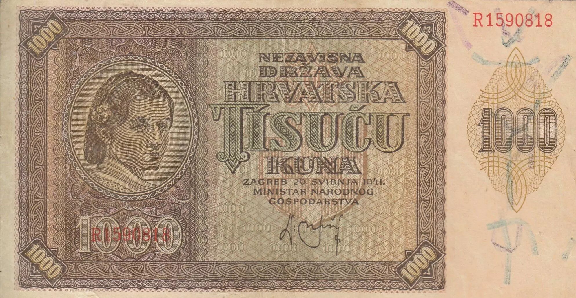 Home > World Banknotes > European Banknotes > Croatia > Croatia 1000 Kuna - Young girl - Mountains - 26-05-1941 - Serial R