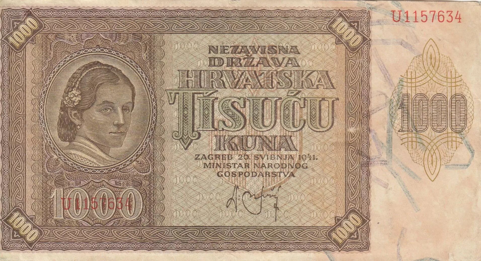 Banknote Croatia 1000 Kuna - Young girl - Mountains - 26-05-1941 - Serial U