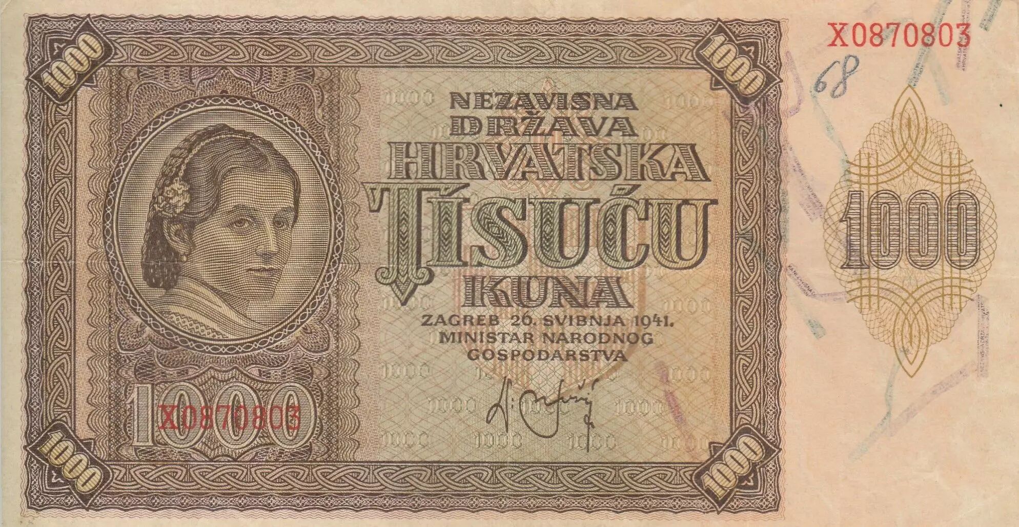 Home > World Banknotes > European Banknotes > Croatia > Croatia 1000 Kuna - Young girl - Mountains - 26-05-1941 - Serial X