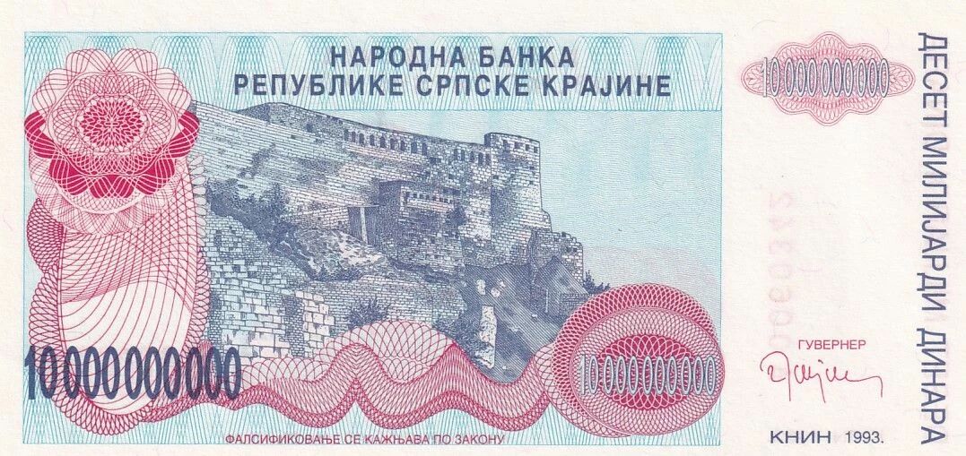 Ce billet de banque a été émis en Croatie en 1993. Sa valeur nominale est de 10 000 000 dinara.