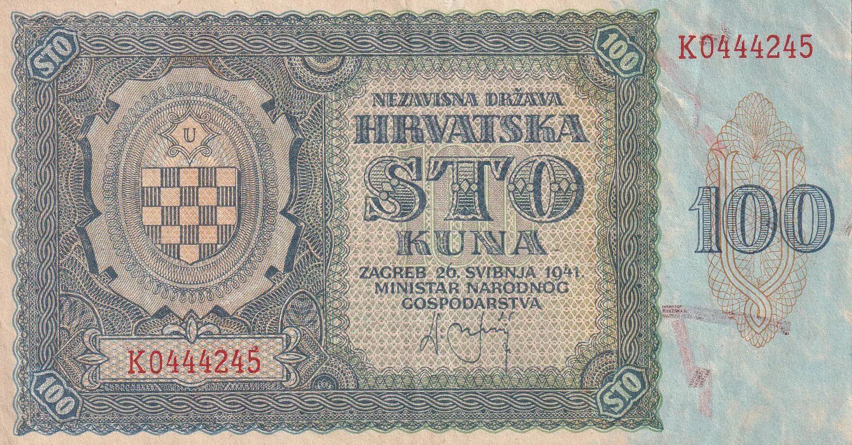 Accueil > Archivage > Croatie 100 Kuna - Bleu-gris - Armoiries - 1941 - Série K - TTB+ - P.2