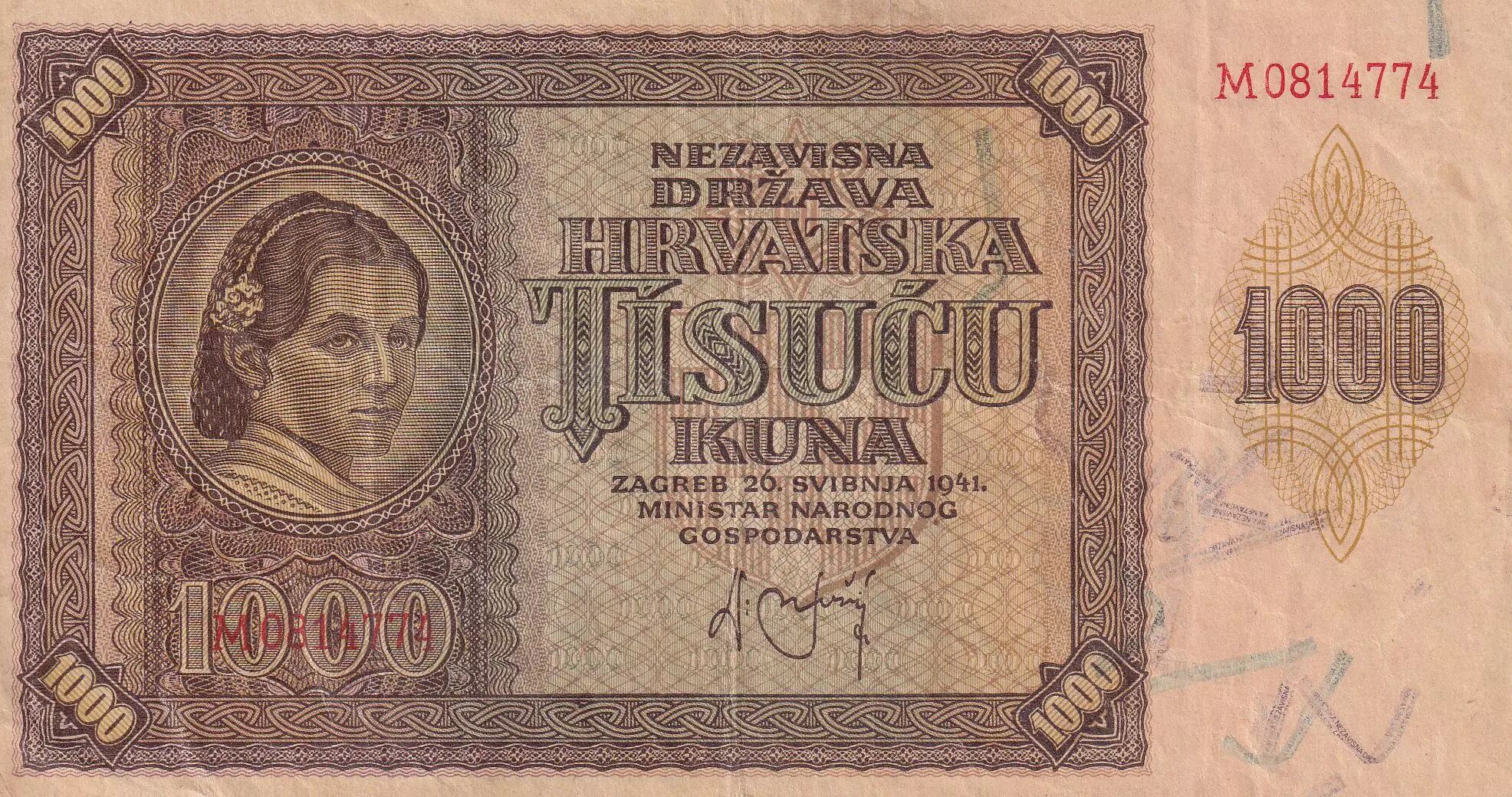 Accueil > Archivage > Croatie 1000 Kuna - jeune fille - montagnes - 1941 - Série M - TTB - P.4