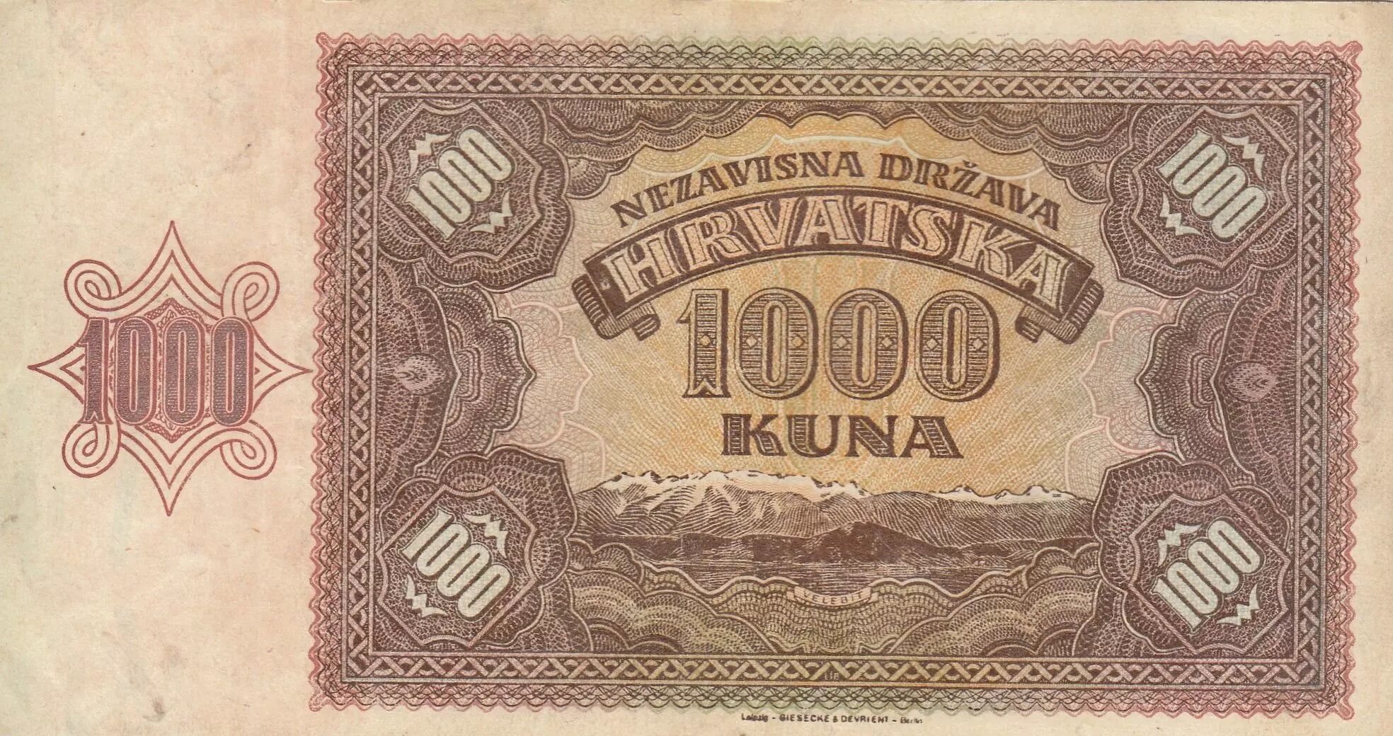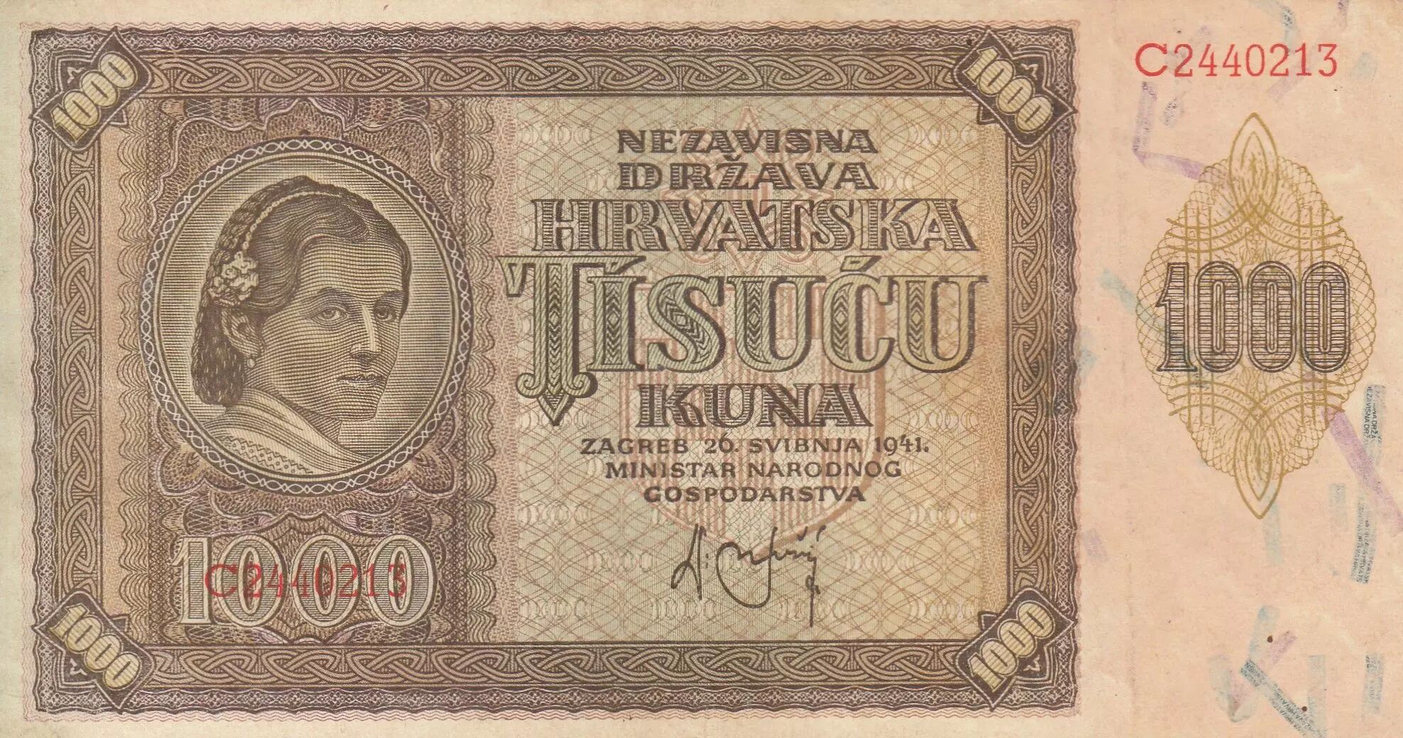 Accueil > Billets du Monde > Billets d'Europe > Croatie > Croatie 1000 Kuna - Jeune fille - Montagnes - 26-05-1941 - Série C