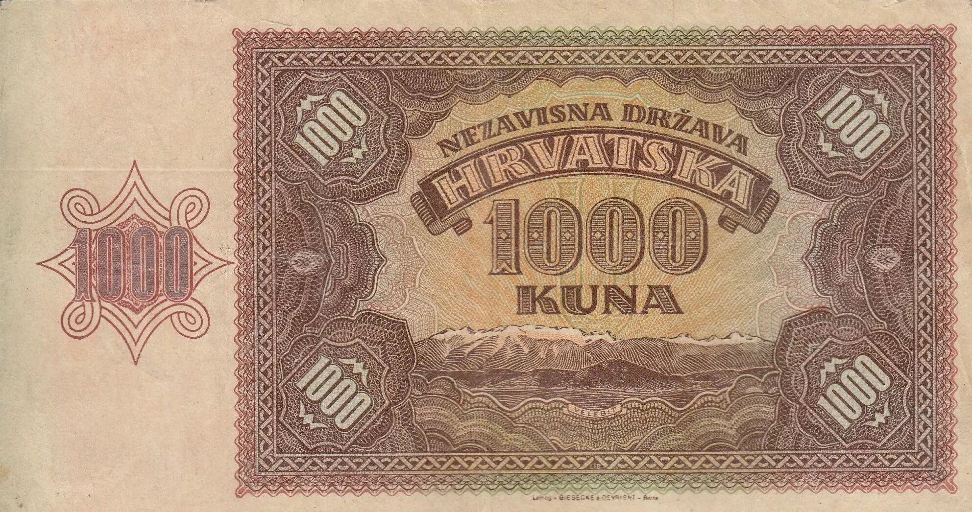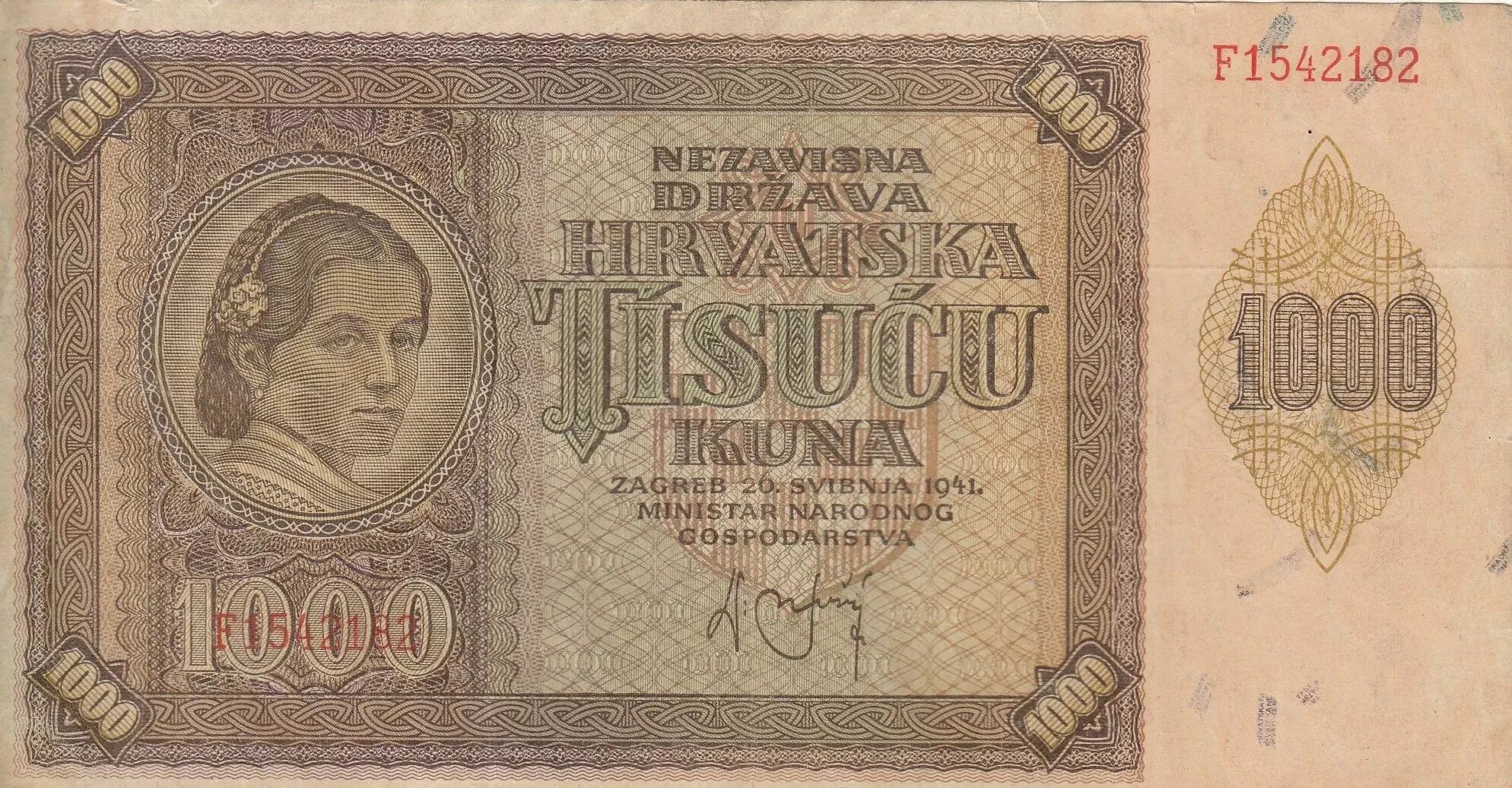 Accueil > Billets du Monde > Billets d'Europe > Croatie > Croatie 1000 Kuna - Jeune fille - Montagnes - 26-05-1941 - Série F