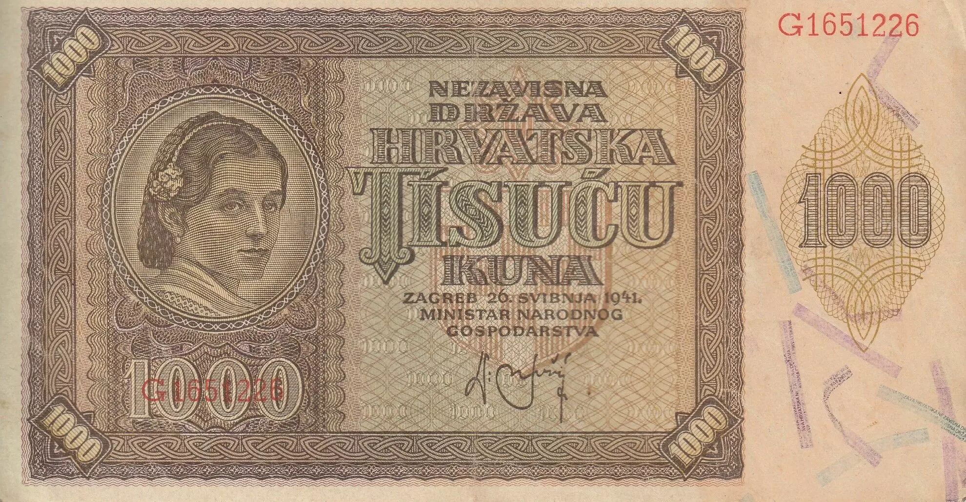 Accueil > Billets du Monde > Billets d'Europe > Croatie > Croatie 1000 Kuna - Jeune fille - Montagnes - 26-05-1941 - Série G