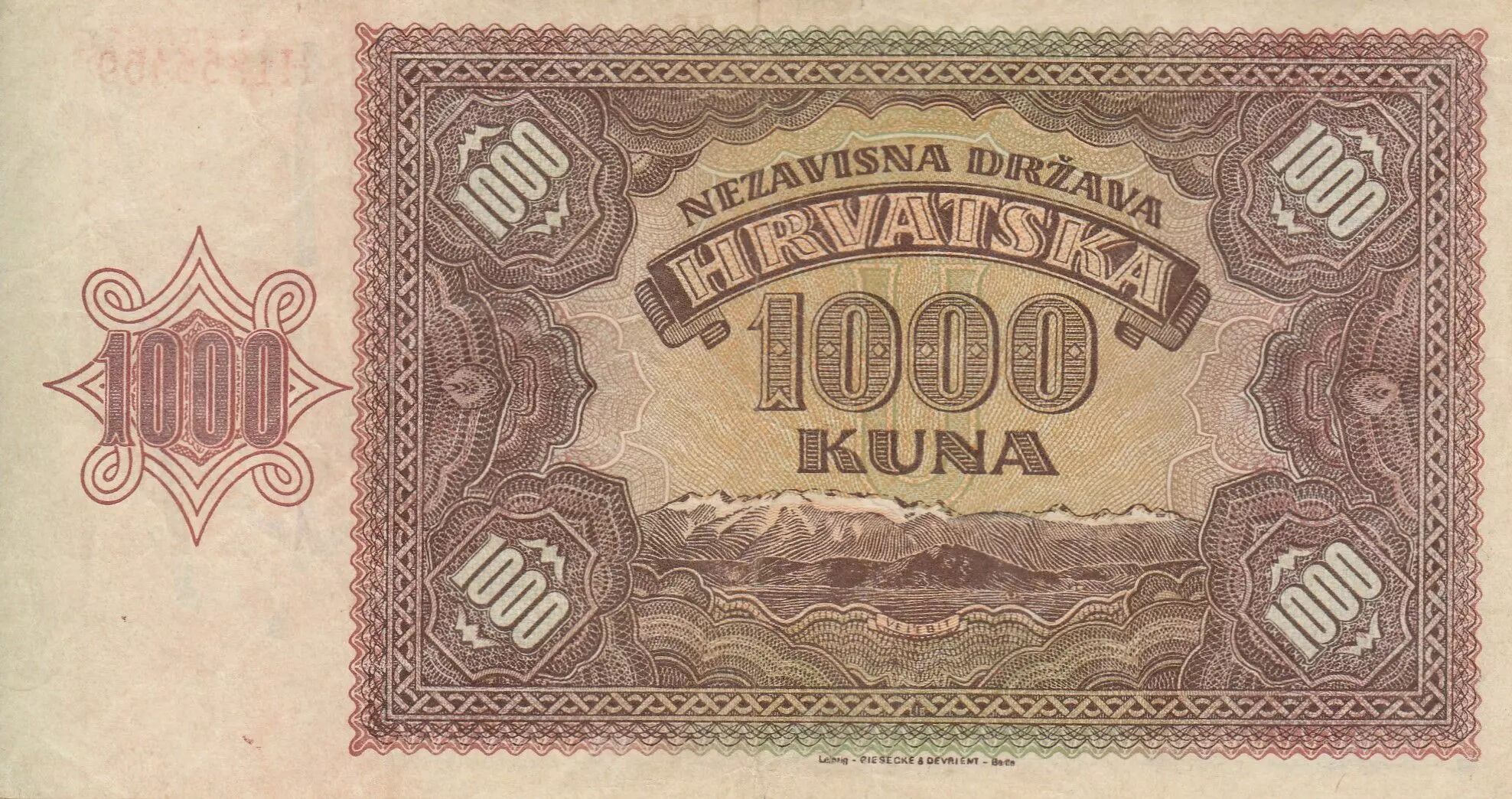 Accueil > Billets du Monde > Billets d'Europe > Croatie > Croatie 1000 Kuna - Jeune fille - Montagnes - 26-05-1941 - Série H