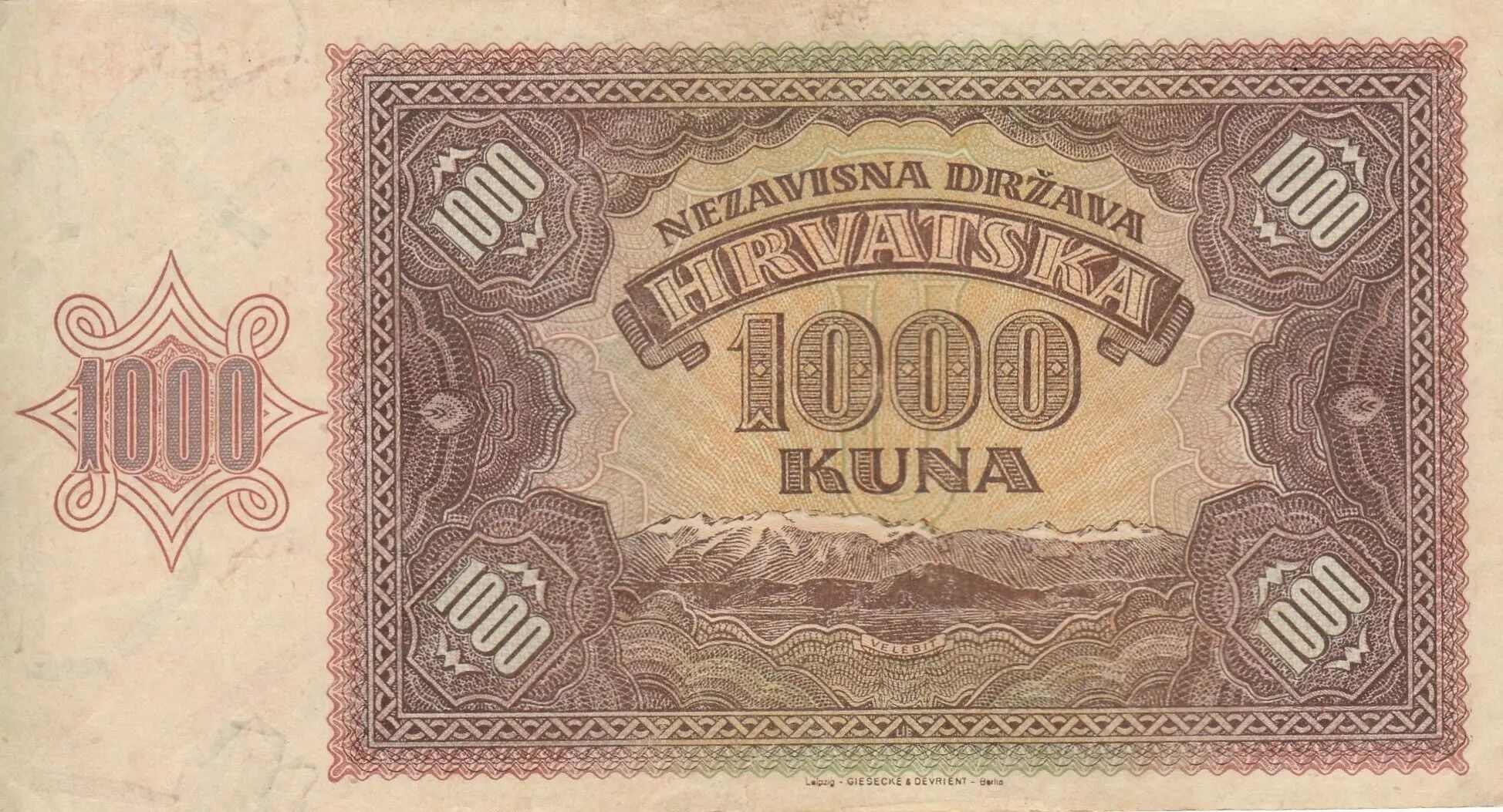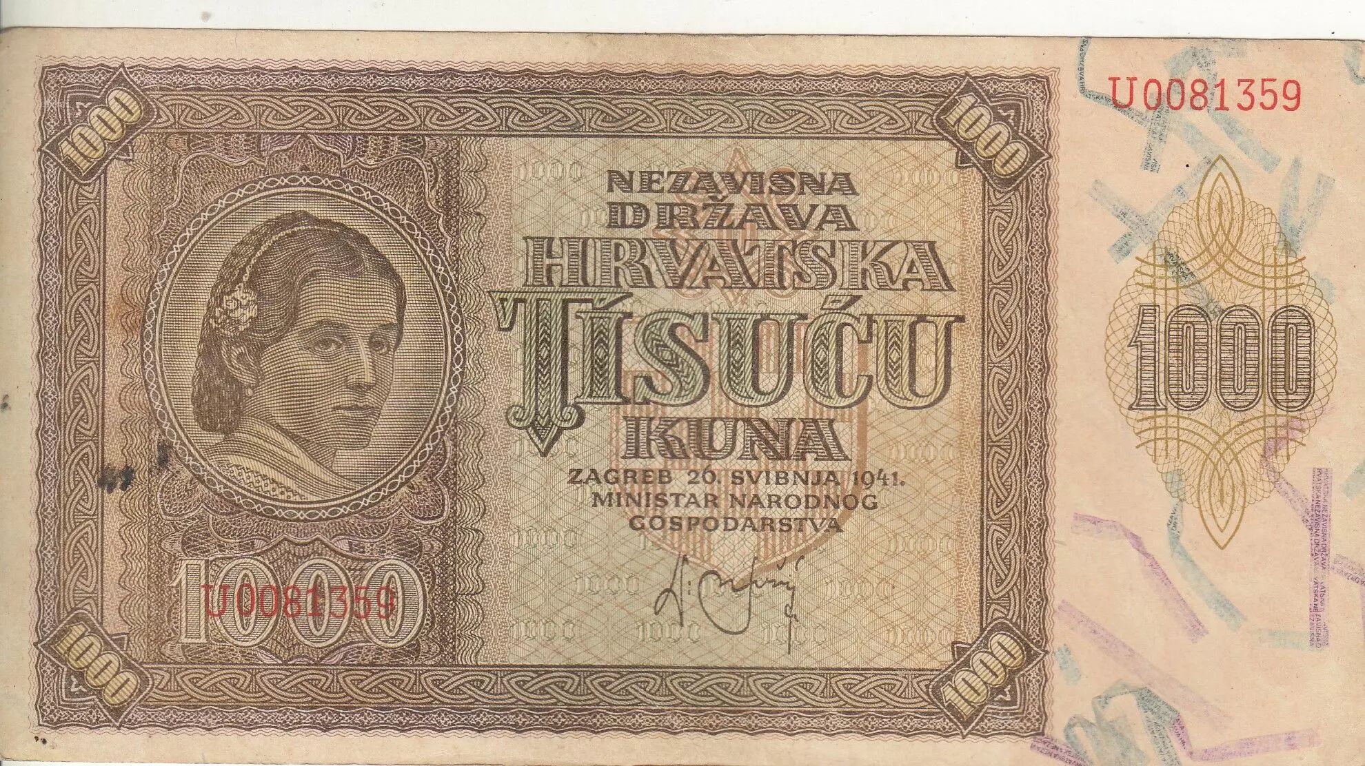 Accueil > Billets du Monde > Billets d'Europe > Croatie > Croatie 1000 Kuna - Jeune fille - Montagnes - 26-05-1941 - Série U