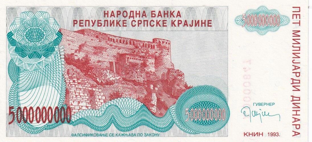 Ce billet de banque est une émission de 1993 de la Croatie, d'une valeur nominale de 5 000 000 000 de dinara. Il appartient à la Série A.