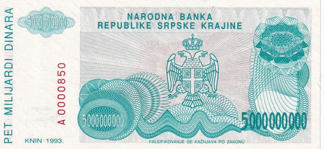Ce billet de banque est une émission de la Croatie, datant de l'année 1993. Il possède une valeur nominale de 5 000 000 000 dinara.
