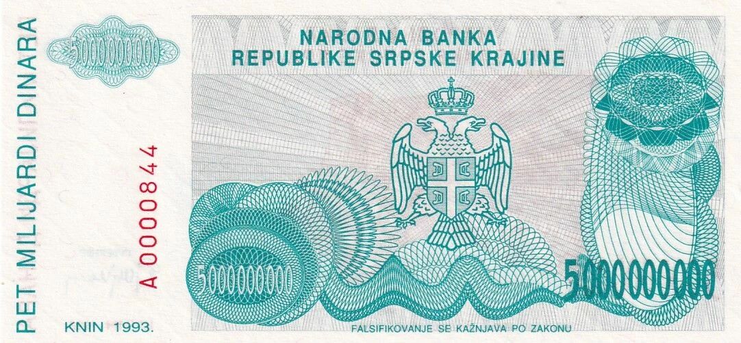 Ce billet de banque est émis par la Croatie et présente une valeur nominale de 5 000 000 000 dinara. Il date de l'année 1993 et appartient à la Série A.