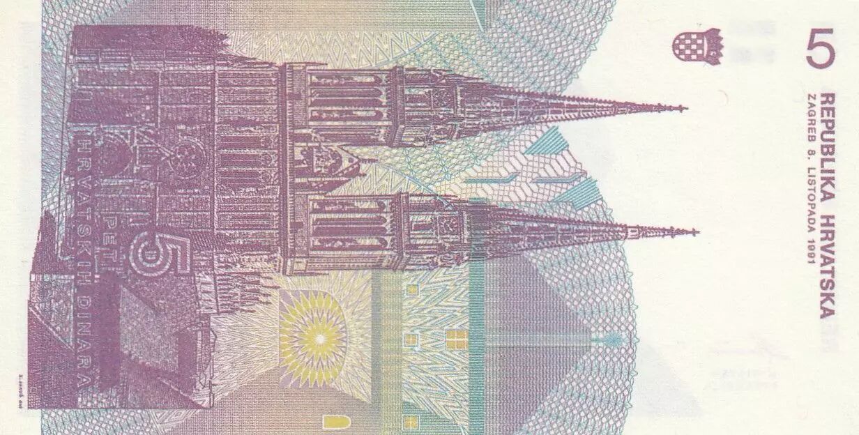 Le revers du billet représente la cathédrale de Zagreb. La mention "REPUBLIKA HRVATSKA" est imprimée en haut, et la valeur faciale "5" est visible en haut à gauche et en bas à droite. La date "ZAGREB 8. LISTOPADA, 1991" est imprimée en bas, commémorant un événement survenu le 8 octobre 1991 à Zagreb.