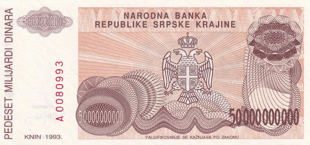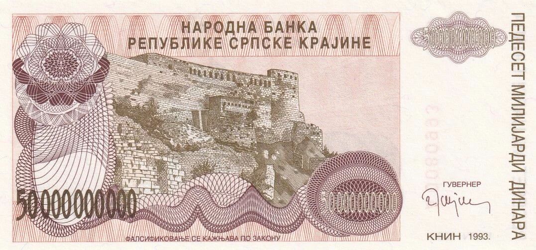 Ce billet de banque de Croatie, d'une valeur nominale de 50 000 000 000 dinara, a été émis en 1993. Il appartient à la série A.