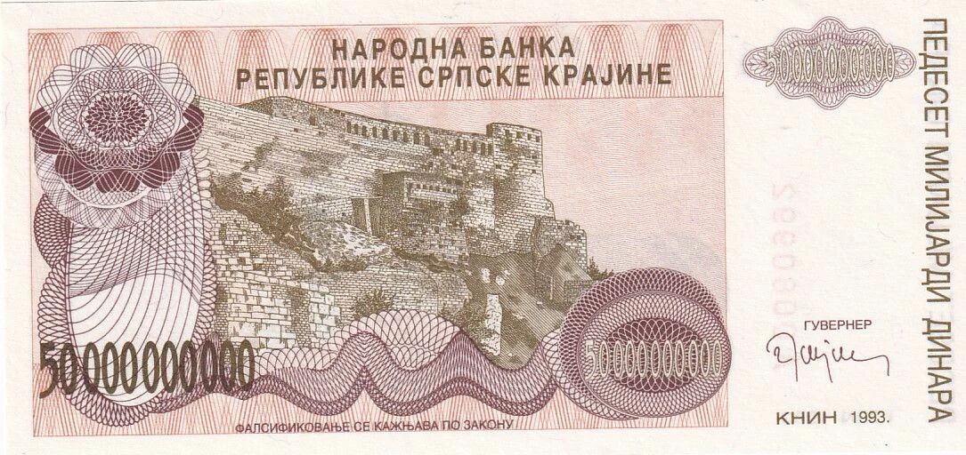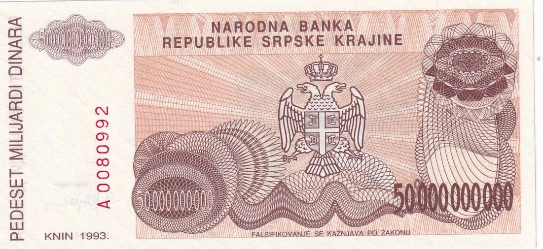 Ce billet de banque provient de Croatie et a été émis en 1993. Sa valeur faciale est de 50 000 000 000 dinara.