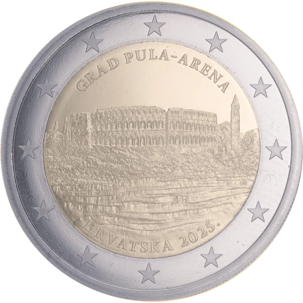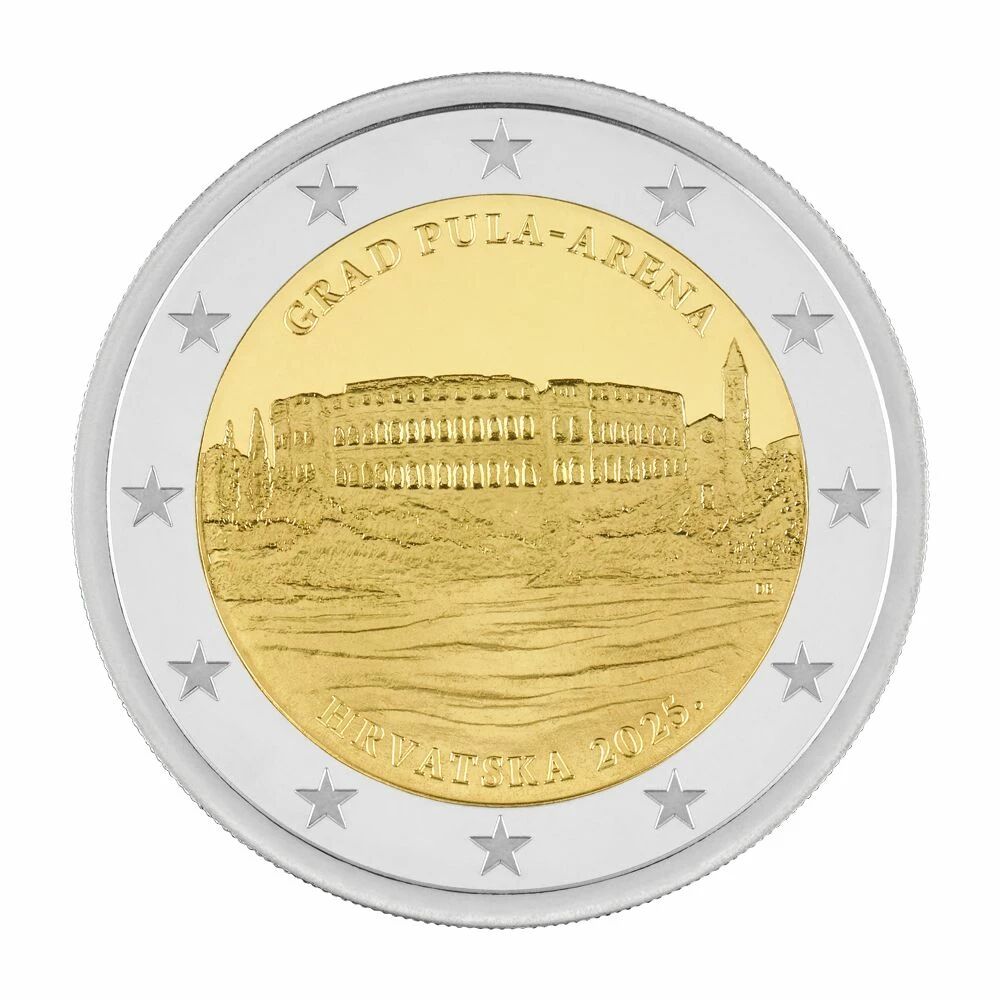La Croatie émettra en 2025 une pièce commémorative de 2 euros dédiée à la ville de Pula et à son amphithéâtre, l'Arena. Cette pièce est frappée en qualité BE.