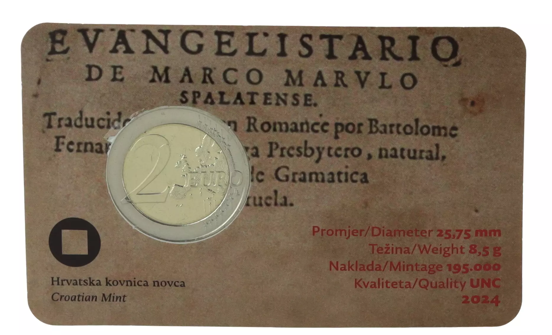 La Banque nationale croate met en circulation la pièce commémorative de 2 euros "Marko Maruli?". À l'occasion de l'anniversaire de Maruli?, la Banque nationale croate émet une pièce commémorative de 2 euros. Le motif de la pièce commémorative représente le portrait de l'écrivain croate Marko Maruli?, dont l'héritage littéraire revêt une importance historique et culturelle pour la République de Croatie, qui était le motif principal de l'avers du billet de 500 kuna.