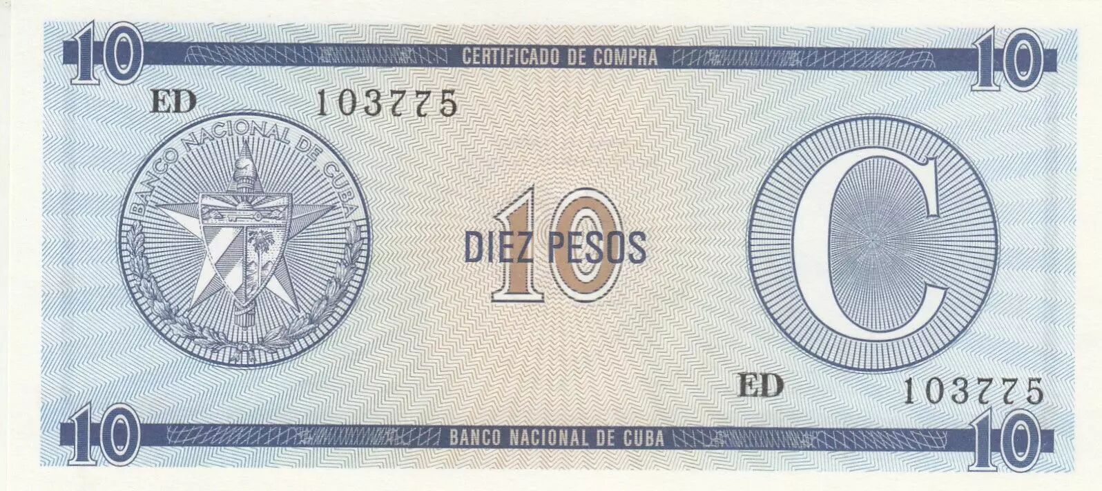 Le billet de 10 Pesos, classifié comme "Certificado de compra" et appartenant à la Série C, est un moyen de paiement émis par Cuba. La valeur nominale de ce billet est de 10 pesos, l'unité monétaire du pays.