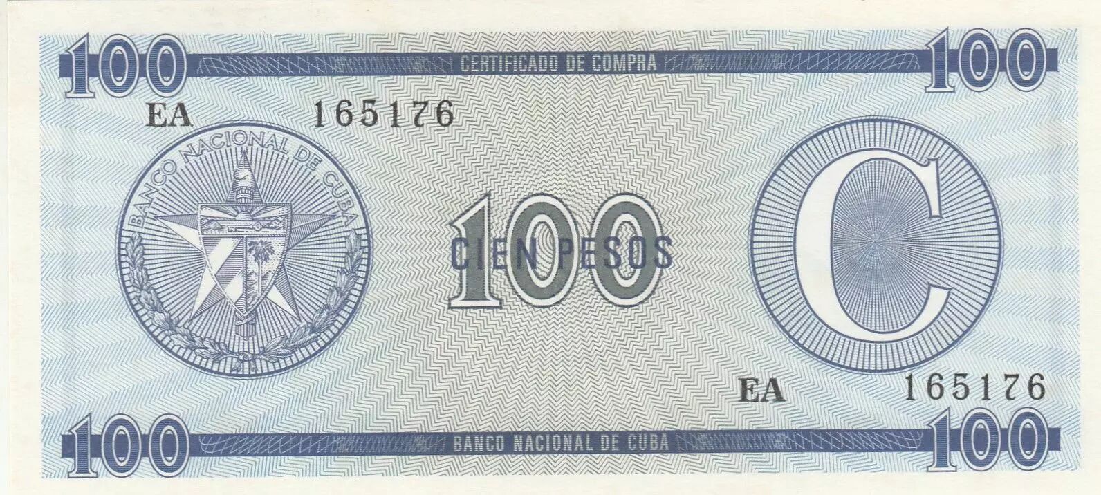 Ce billet de banque est un "Certificado de Compra" d'une valeur de 100 pesos, émis à Cuba. Il appartient à la Série C. Ces certificats étaient utilisés dans un contexte économique spécifique à Cuba, possiblement lié à des restrictions d'accès à certains biens ou services pour les détenteurs de monnaie locale.