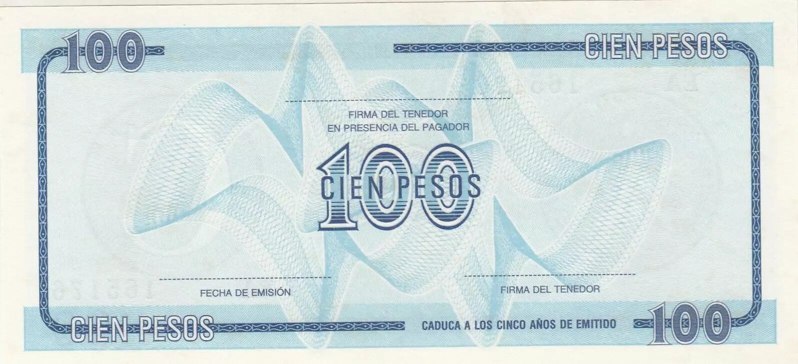 Le billet présente une conception visuelle particulière, propre à ce type de document financier. Les couleurs, les motifs et les symboles utilisés reflètent l'identité visuelle de l'époque et du pays émetteur. La valeur nominale, "100 Pesos", est clairement indiquée sur le billet, probablement à plusieurs endroits pour faciliter son identification et éviter toute confusion. Le terme "Certificado de Compra" est également mis en évidence, soulignant sa fonction spécifique.