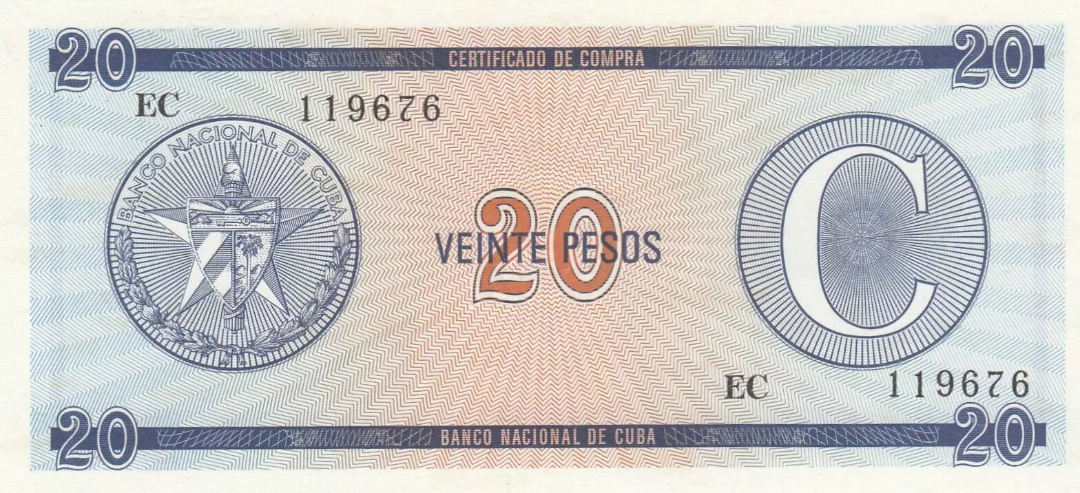 Le recto du billet présente des motifs complexes et des couleurs vives. Au centre, la valeur faciale "20" est affichée de manière proéminente, accompagnée de la mention "Certificado de Compra". Des signatures officielles et des filigranes de sécurité sont également présents pour authentifier le billet. Les couleurs dominantes incluent des nuances de vert, d'orange et de jaune, créant un contraste visuellement attrayant. Des éléments graphiques tels que des motifs géométriques et des symboles nationaux cubains sont intégrés dans le design.