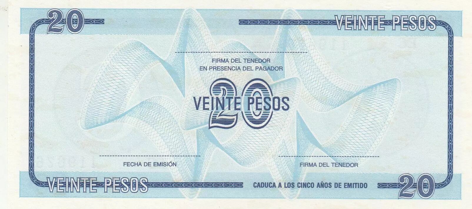 Le verso du billet poursuit le thème visuel avec des motifs similaires et des couleurs complémentaires. La valeur faciale "20" est répétée, et des textes légaux ou informatifs sont inclus. Les éléments graphiques peuvent inclure des représentations de l'histoire cubaine, de la culture ou de la nature. La qualité d'impression est soignée, avec des détails fins et des textures subtiles qui ajoutent à l'esthétique globale du billet. Les couleurs sont harmonieusement combinées pour créer un design cohérent et attrayant.
