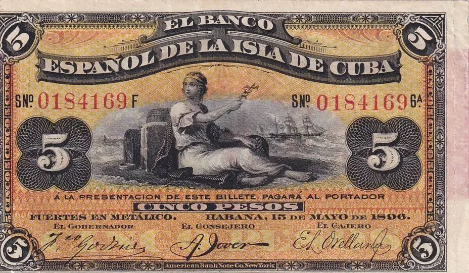 Billet Cuba 5 Pesos - Femme, bateaux -Surchargé Plata - 1896 - P.48b