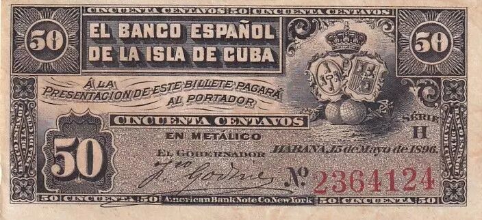 Banknote Cuba 50 centavos - Royal crown - Arms - Serial H - 1896