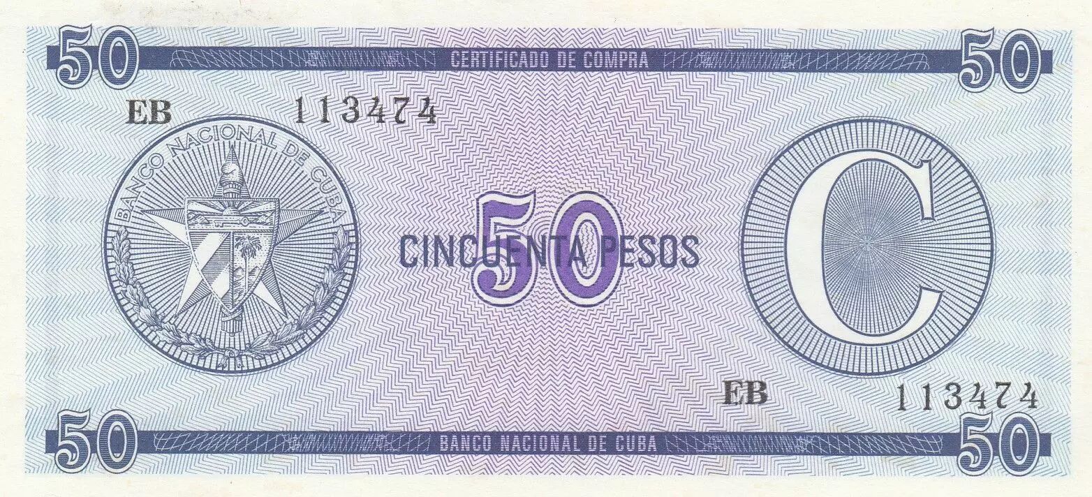 Ce billet de banque cubain est un "Certificado de compra" d'une valeur de 50 pesos. Il appartient à la Série C. Le pays émetteur est Cuba.