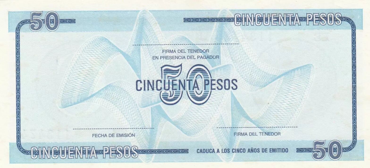 La valeur nominale de 50 pesos est imprimée en chiffres et en lettres sur le billet. Les inscriptions officielles incluent probablement la désignation "Certificado de compra" ainsi que d'autres mentions légales ou réglementaires. Les motifs graphiques peuvent inclure des symboles nationaux ou des illustrations thématiques, reflétant l'idéologie et les valeurs du gouvernement cubain de l'époque.