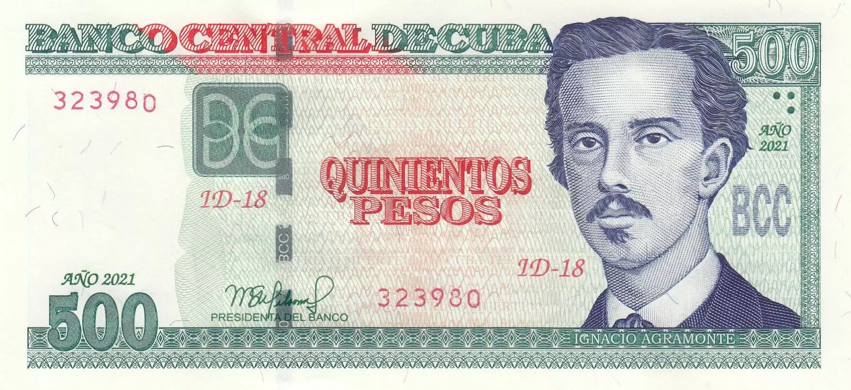 The 500 Cuban Peso banknote issued in 2021, from the LD series, features a portrait of Ignacio Agramonte y Loynáz on its obverse. The inscription "BANCO CENTRAL DE CUBA" appears at the top, followed by the denomination "QUINIENTOS PESOS" and the acronym "BCC". The value "500" is repeated in two locations on the obverse.