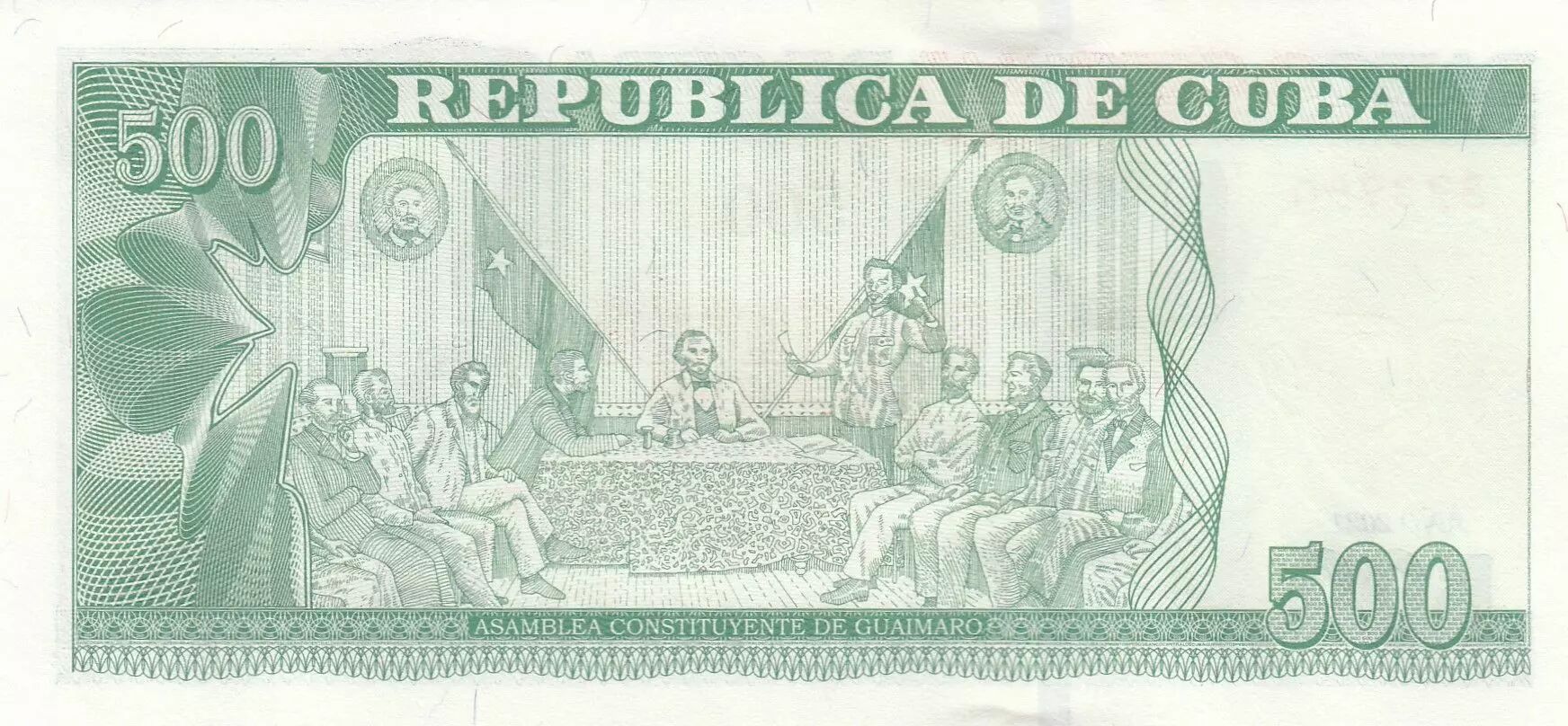 The reverse of the banknote depicts a scene from the Guáimaro Constituent Assembly, dated April 10, 1869. Carlos Manuel de Céspedes and other figures are depicted around a table, with flags and portraits in the background. The inscription "REPUBLICA DE CUBA" appears at the top, followed by the mention "ASAMBLEA CONSTITUYENTE DE GUÁIMARO". The value "500" is also present on this side.