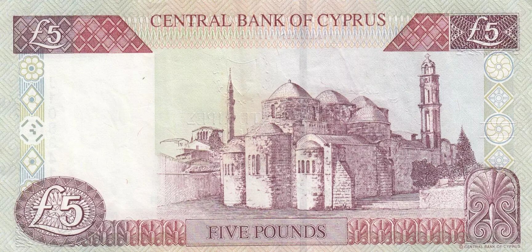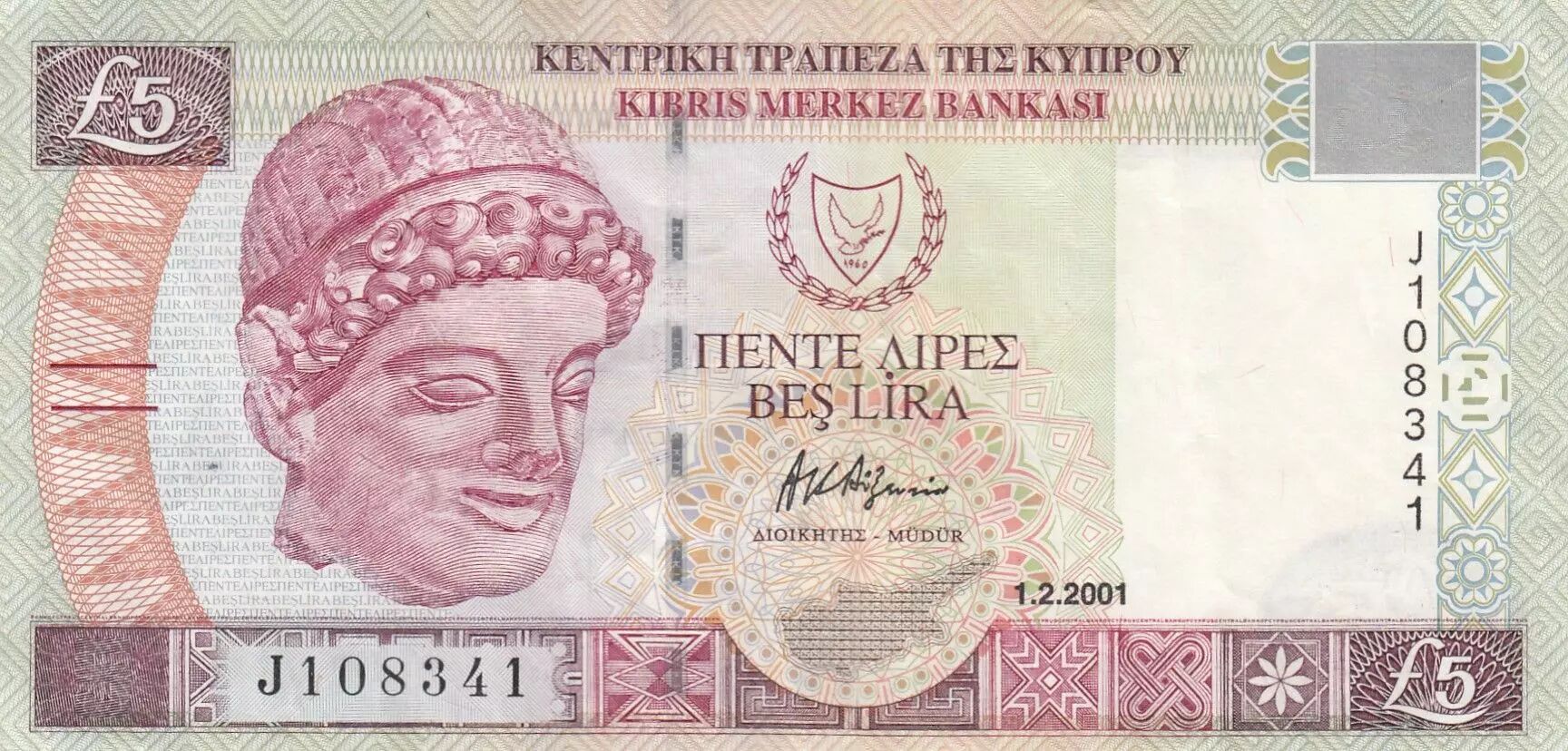 Banknote Cyprus 5 pounds - Head of young man - Church and Mosque - 2001 - J108341