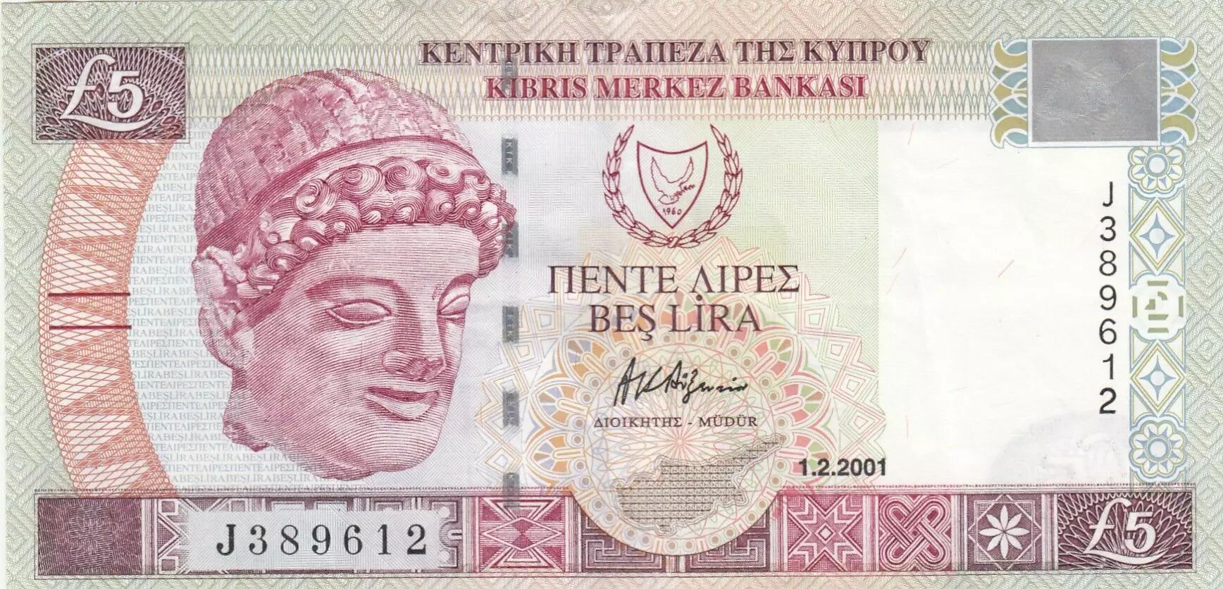 Banknote Cyprus 5 pounds - Head of young man - Church and Mosque - 2001 - J389612