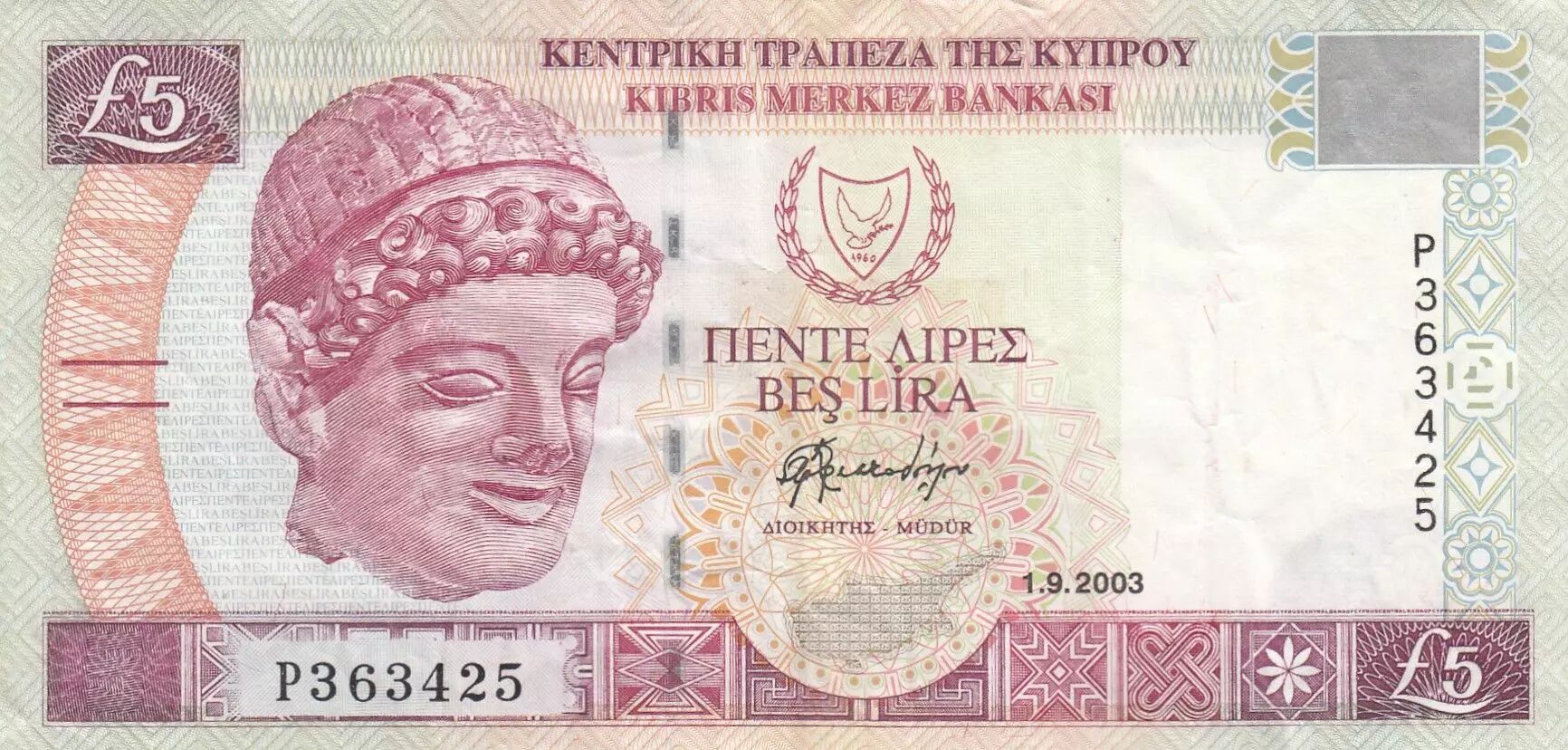 Banknote Cyprus 5 pounds - Head of young man - Church and Mosque - 2003 - P363425
