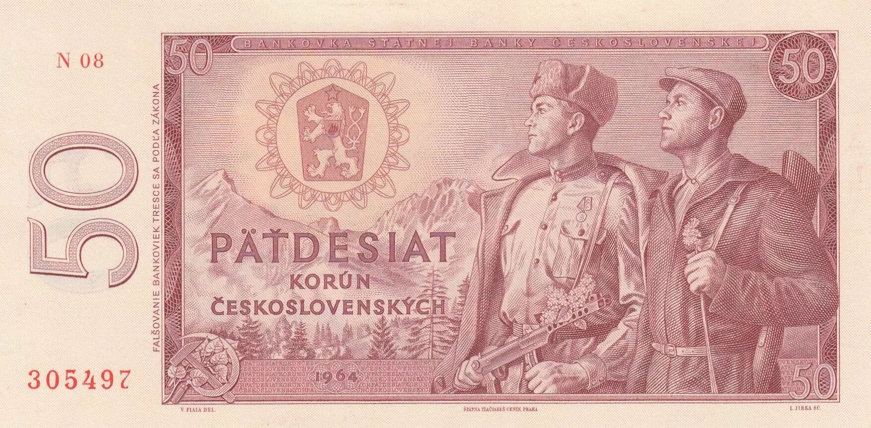 This banknote from Czechoslovakia was issued in 1964 and has a face value of 50 korun. The banknote measures 150 mm long and 74 mm wide.