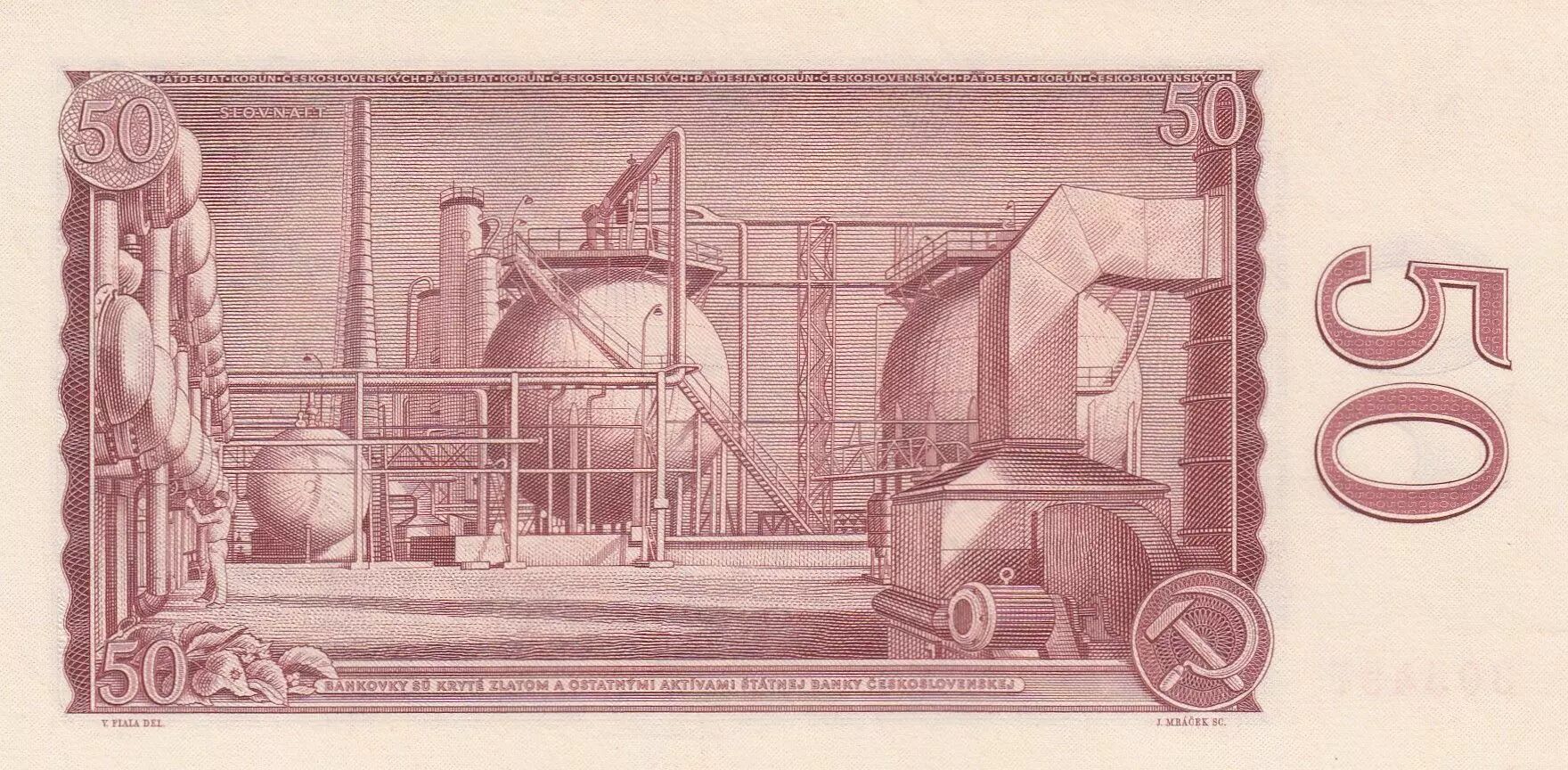 On the reverse, a depiction of the Slovnaft oil refinery, located in Bratislava, is highlighted. The writing used on the banknote is Latin. You can read the signature of V. Fiala DEL MRÁ?EK SC., indicating the artists involved in the design of the banknote. Jan Mrá?ek is credited as the engraver, while Václav Fiala is designated as the designer.