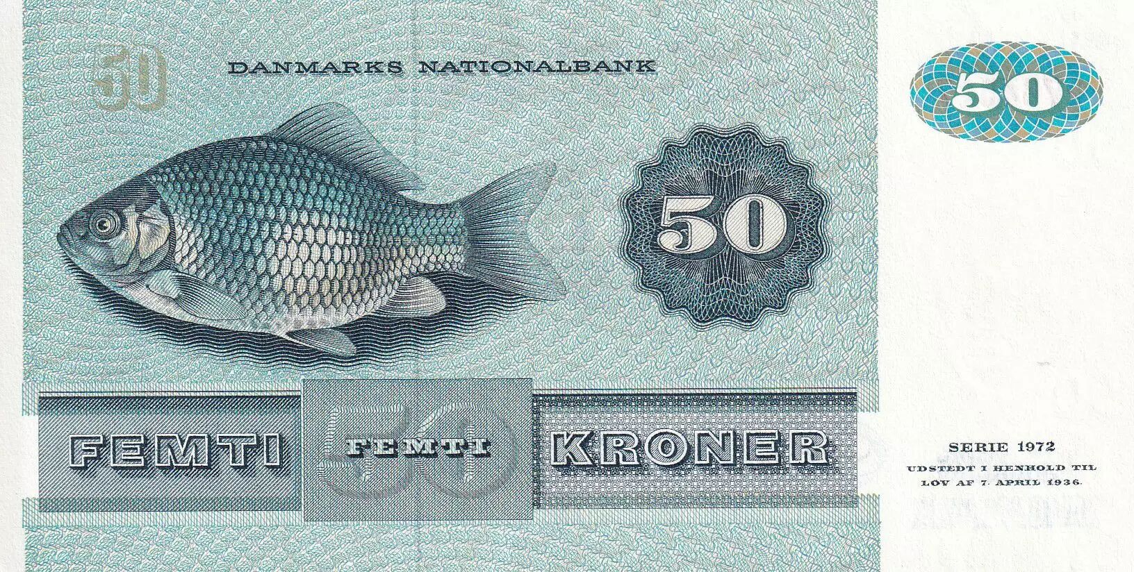 Accueil > Billets du Monde > Billets d'Europe > Danemark > Danemark 50 Kroner - Mme Ryberg - Poisson - 1972 - P.50