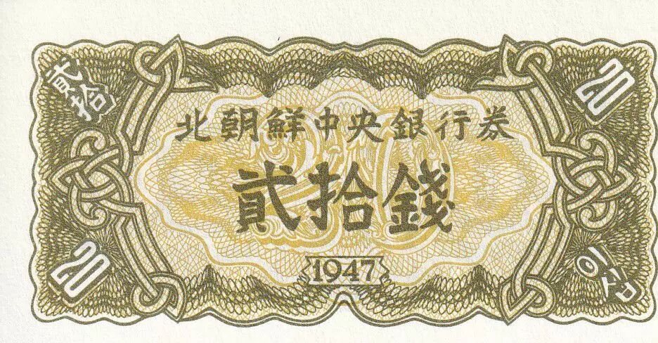 Banknote Democratic People´s Republic of Korea 20 Chon - Green and yellow - 1947 - UNC - P.6b
