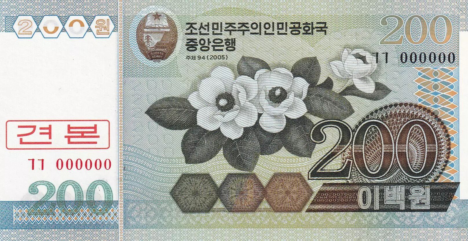 Banknote Democratic People´s Republic of Korea 200 Won - Flowers - Specimen - 1999 - P.48s