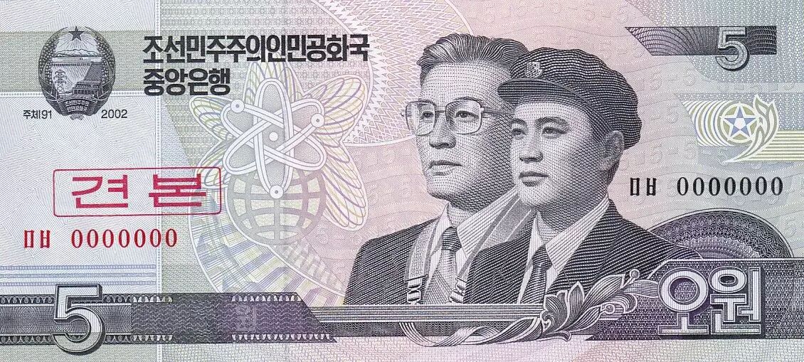 The 5 North Korean won banknote, dated 2002 but issued in 2009, features distinct visual characteristics on both sides.