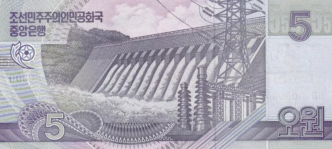 The reverse of the banknote illustrates a hydroelectric dam, highlighting the importance of energy and industry in the country. Inscriptions in Hangeul reiterate the name of the Central Bank of the Democratic People's Republic of Korea, as well as the face value of five won.