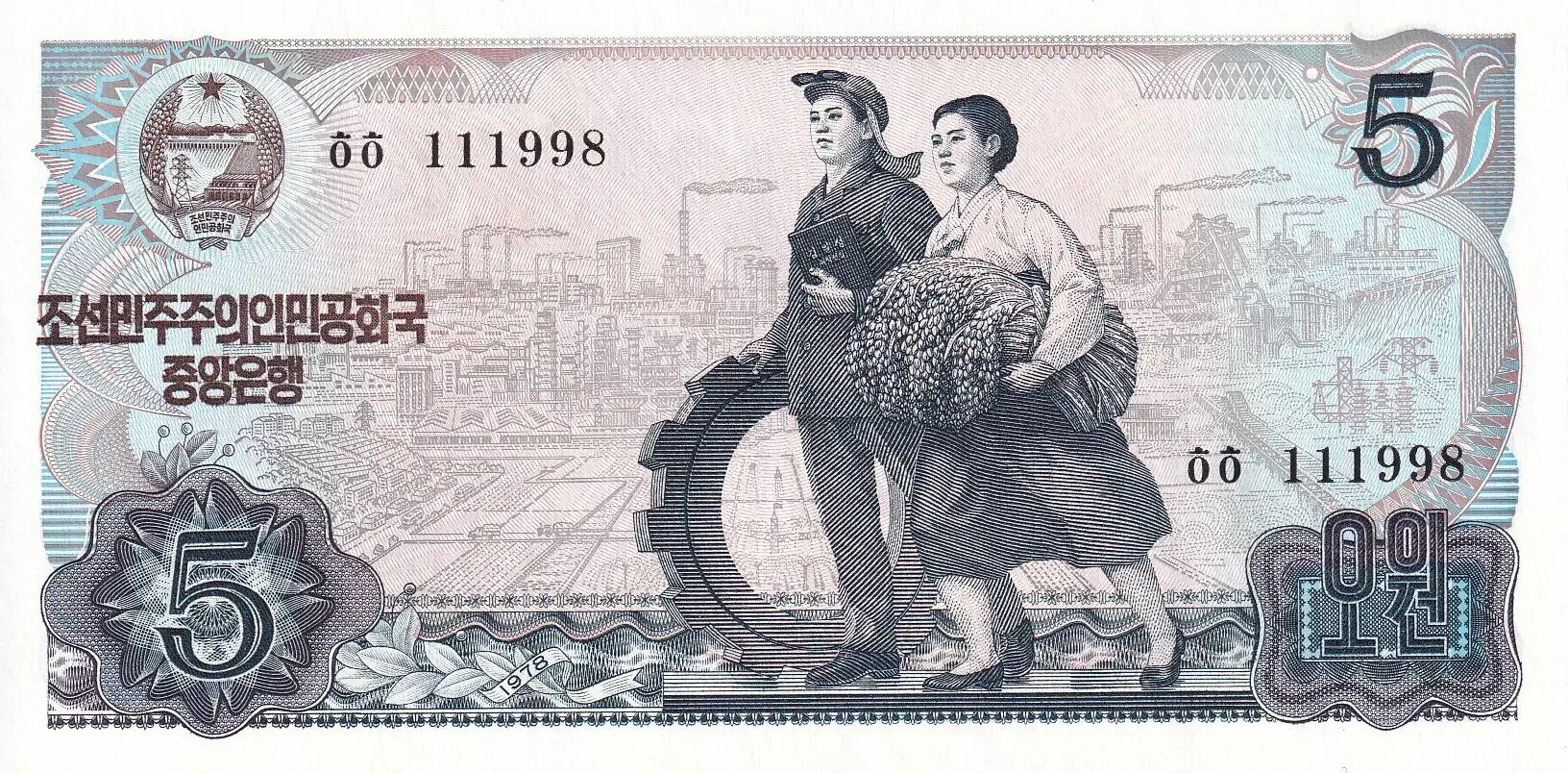 Banknote Democratic People´s Republic of Korea 5 won - Worker, farmer - Mount Gumgang - 1978 - UNC - P.19b