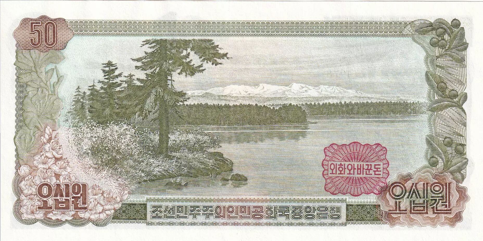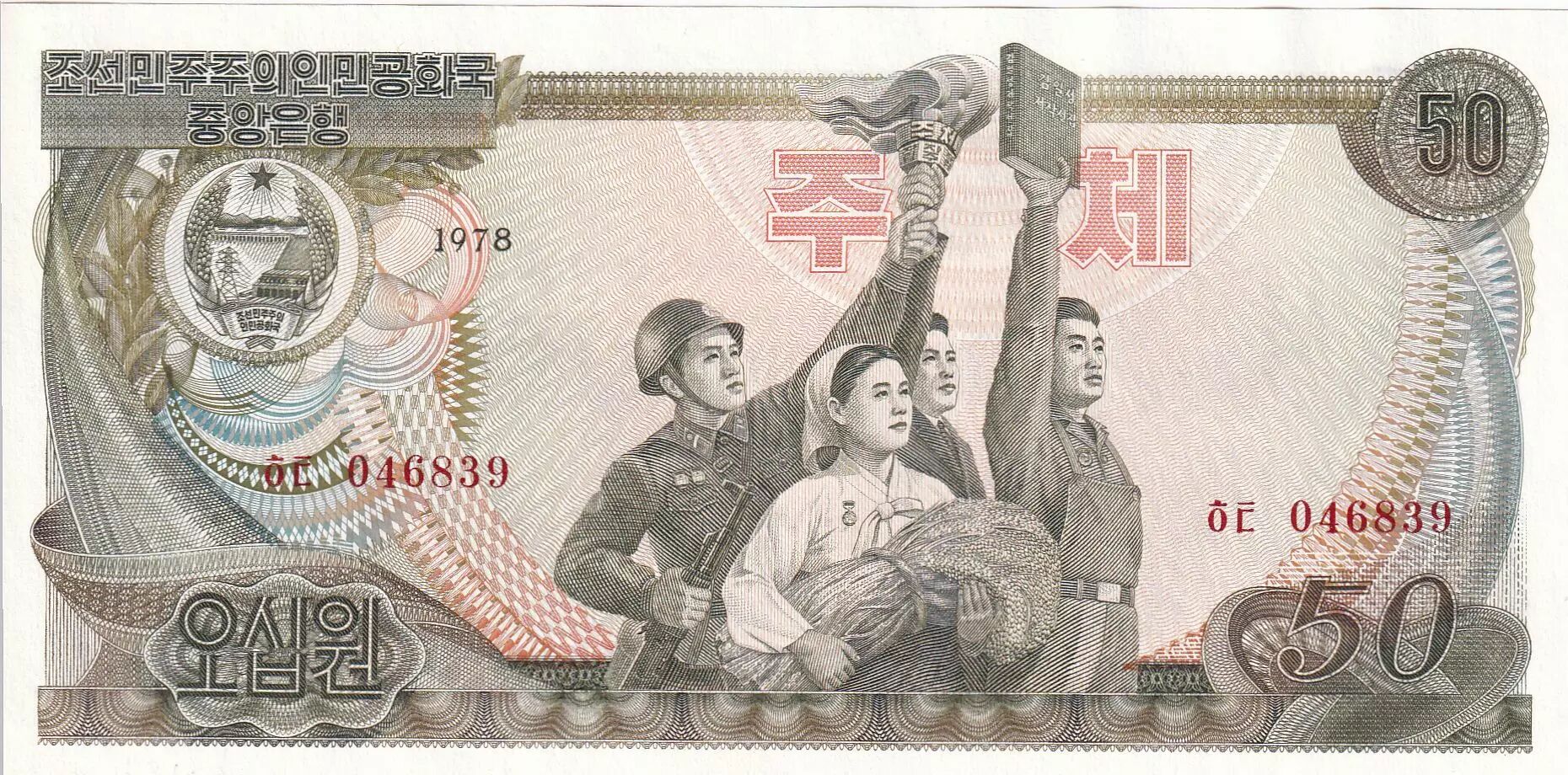 Banknote Democratic People´s Republic of Korea 50 Won - Soldier - Torch, red book - Lake - 1978 - UNC - P.21c