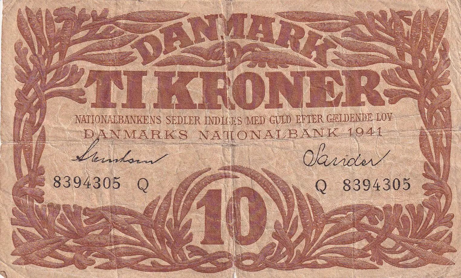 Home > > Denmark 10 Kroner - 1941 - VG+ - Letter Q - P.31