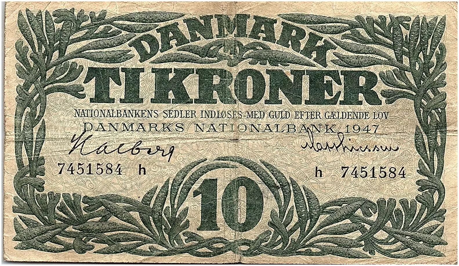 Home > World Banknotes > European Banknotes > Denmark > Denmark 10 Kroner 1947 - VF - Letter h - P.37