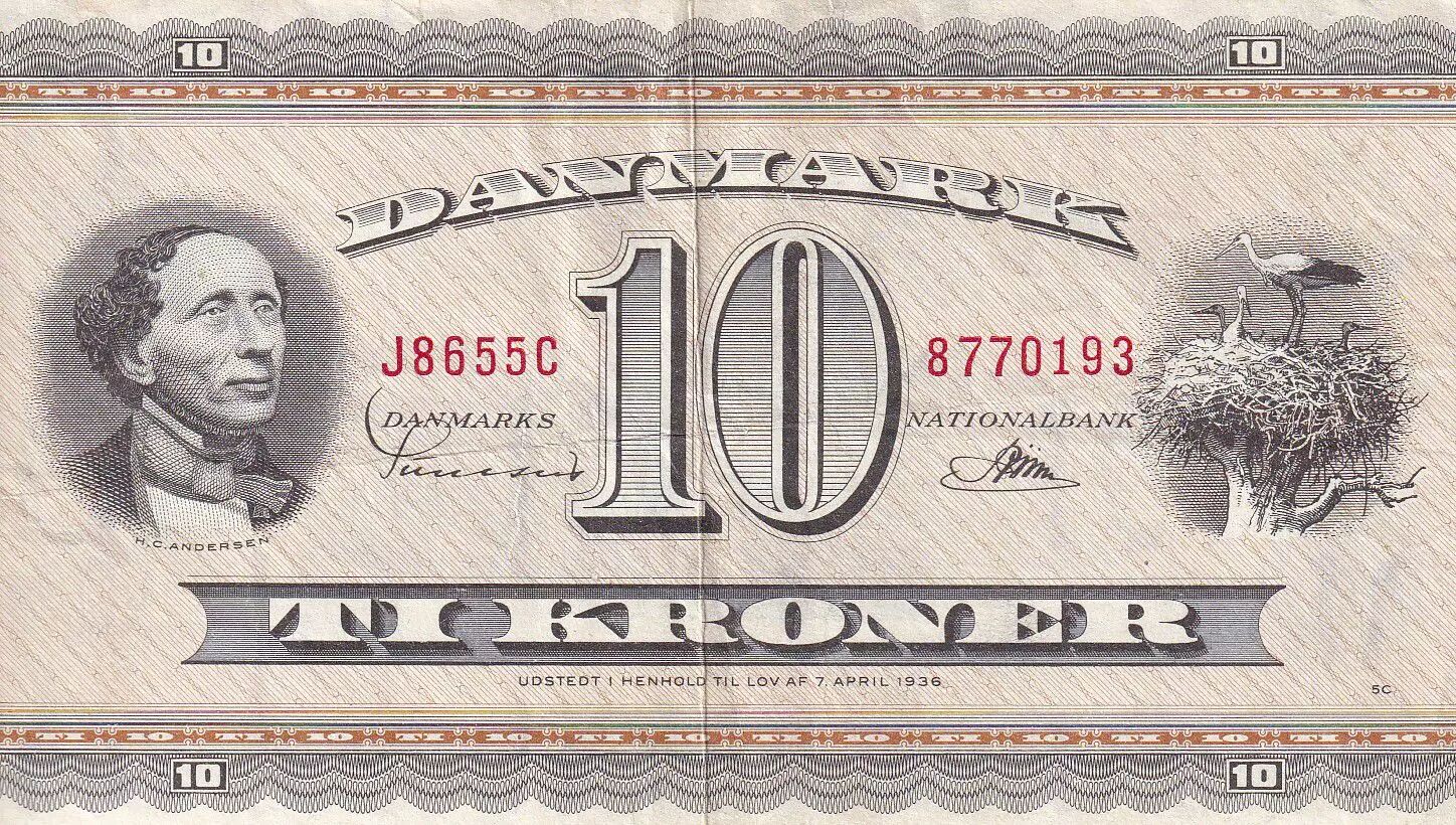 Banknote Denmark 10 Kroner - Hans Christian Andersen - White storks - 1965 - Serial J8 - P.44y