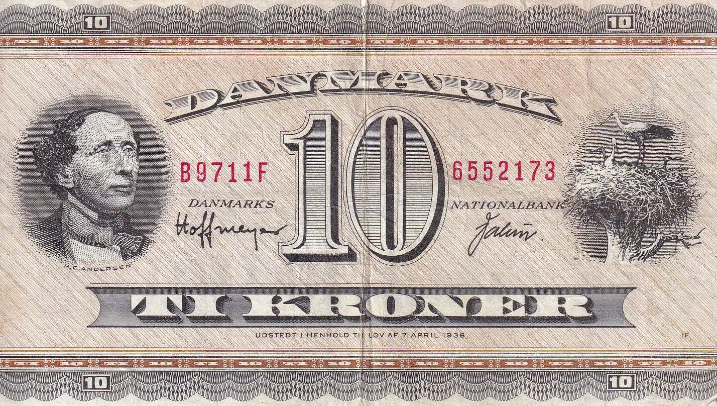 Banknote Denmark 10 Kroner - Hans Christian Andersen - White storks - 1971 - Serial B9 - P.44ae